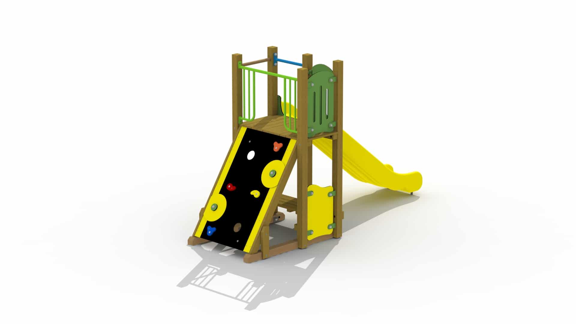 Een klimtoestel met een rotswand langs de ene zijde en een kunststof glijbaan en verticale ladder aan de andere zijde voor kinderen van 3 tot 12 jaar. Onderaan is een speelhuisje met zitbankje voorzien. Het geheel is ideaal voor reeds verharde oppervlakten omdat alleen de glijbaan in de grond verankerd moeten worden. De bevestiging van de onderbalken kan gebeuren met grondankers (T600). Hiervoor is beton nodig. Alle metalen onderdelen worden roestvrij voorbehandeld en alle moeren en bouten worden volledig afgeschermd met bloemvormige kunststof afdekdoppen. Aan dit toestel kan een extra rechte glijstang (ref. S010) of spiraalglijstang (ref. S020) toegevoegd worden.Er is keuze tussen rode of groene zijwanden op alle structuren!