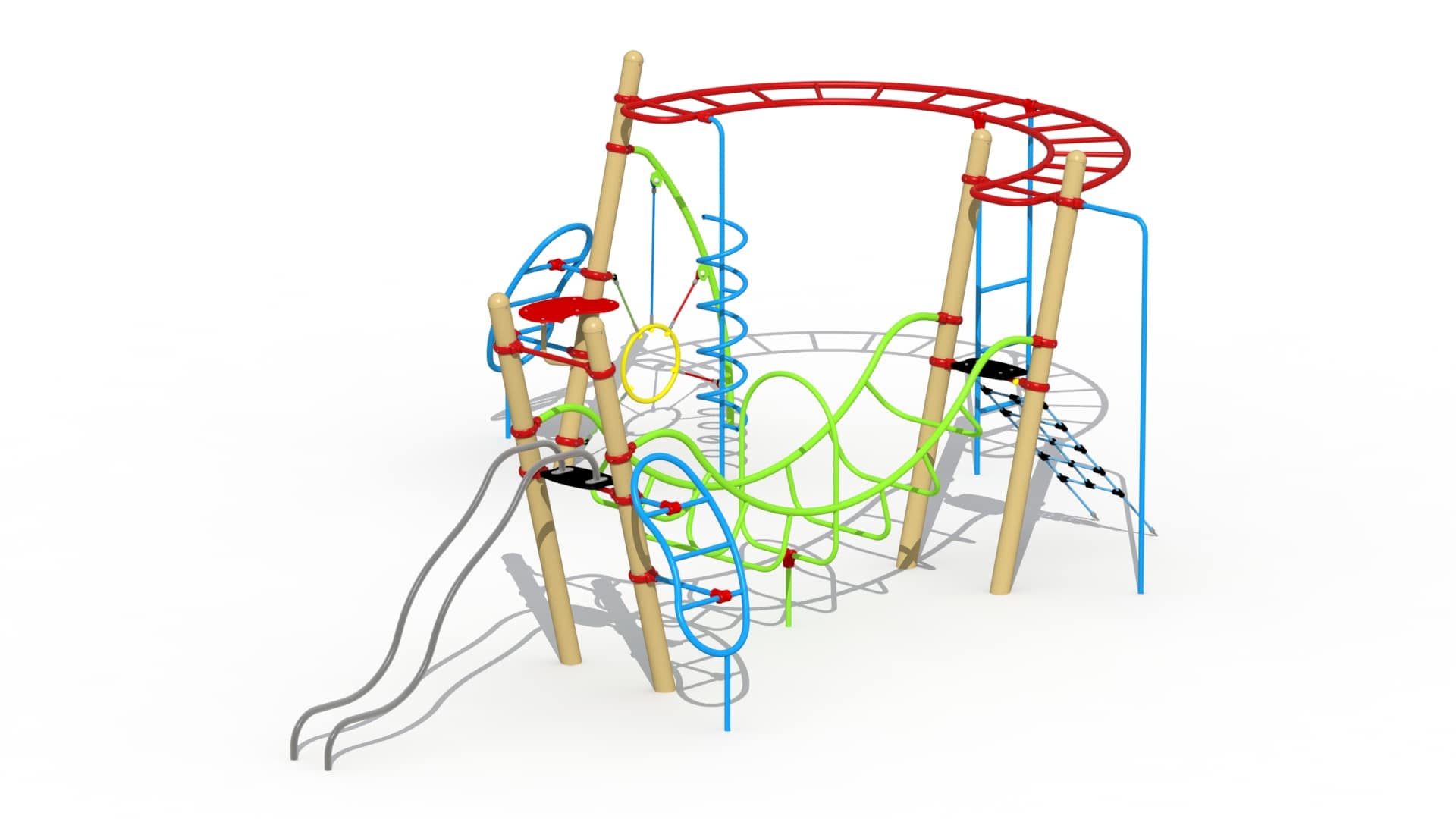 Uitdagend eigentijds klimtoestel voor kinderen van 6-15 jaar. Het speeltoestel bestaat uit diverse schuingeplaatste palen met diameter 127mm. Een horizontale U-vormige ladder met hangsporten bevestigd door middel aluminium bevestigingsklemmen is voorzien van een spiraalglijstang, een rechte glijstang en middenin een verticale sportenladder. Aan de ene zijde van de U-vormige ladder bevindt zich een metalen boonvormige klimladder, een klimring opgespannen aan 16 mm polypropyleen touw met staalkabelversterking en een startplatform uit HDPE polyethyleen plaatmateriaal. De andere zijde van de U-vormige ladder is opgebouwd uit vier schuingeplaatste palen waaraan diverse klim- en glijelementen bevestigd zitten.