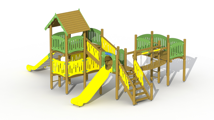 Een speeltoestel met een hoge uitkijktoren met zadeldak en hoge inox glijbaan, bestaande uit twee verdiepingen. Het geheel is verbonden met twee lagere platforms door middel van een hangbrug en een schuinliggend loopvlak. Aan de hoogste toren is een verticale klimladder bevestigd; onderaan is een speelhuisje ingericht. Eén van de kleinere platformen heeft een verticale klimladder, de andere een gemakkelijke trap en een lage kunststof glijbaan. Mits supplement kan een tweede hoge inox glijbaan of spiraalglijbaan geplaatst worden. Daarnaast zijn ook nog volgende aanbouwelementen mogelijk: hoge glijstang (S004), apenladder (S005), klimboog (S006), rotswand (S007), lage glijstang (S008), e.d.