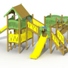 Een speeltoestel met een hoge uitkijktoren met zadeldak en hoge inox glijbaan, bestaande uit twee verdiepingen. Het geheel is verbonden met twee lagere platforms door middel van een hangbrug en een schuinliggend loopvlak. Aan de hoogste toren is een verticale…