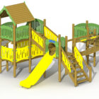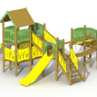 Een speeltoestel met een hoge uitkijktoren met zadeldak en hoge inox glijbaan, bestaande uit twee verdiepingen. Het geheel is verbonden met twee lagere platforms door middel van een hangbrug en een schuinliggend loopvlak. Aan de hoogste toren is een verticale…