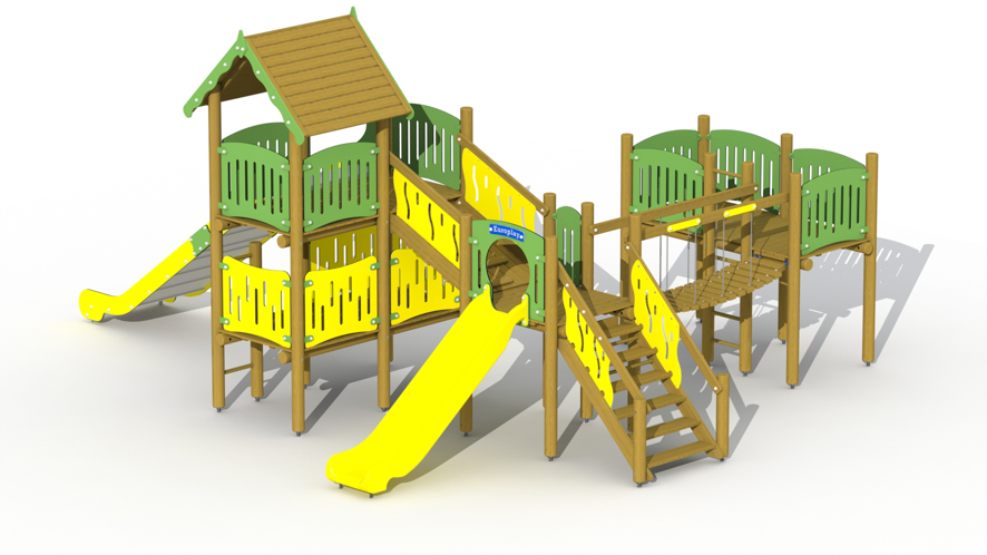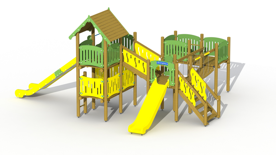 Een speeltoestel met een hoge uitkijktoren met zadeldak en hoge inox glijbaan, bestaande uit twee verdiepingen. Het geheel is verbonden met twee lagere platforms door middel van een hangbrug en een schuinliggend loopvlak. Aan de hoogste toren is een verticale klimladder bevestigd; onderaan is een speelhuisje ingericht. Eén van de kleinere platformen heeft een verticale klimladder, de andere een gemakkelijke trap en een lage kunststof glijbaan. Mits supplement kan een tweede hoge inox glijbaan of spiraalglijbaan geplaatst worden. Daarnaast zijn ook nog volgende aanbouwelementen mogelijk: hoge glijstang (S004), apenladder (S005), klimboog (S006), rotswand (S007), lage glijstang (S008), e.d.