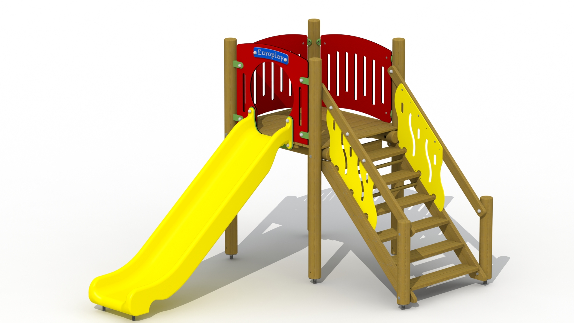 Een platform op vier rondhouten lariks palen dat bereikt kan worden via een gemakkelijke trap en dat verlaten kan worden via een kunststof glijbaan van 0,5 meter breed. De rondhouten palen worden met metalen voetsteunen in of op de grond geplaatst worden. Alle metalen onderdelen zijn roestvrij voorbehandeld en alle moeren en bouten worden volledig afgeschermd met bloemvormige kunststof afdekdoppen. Deze constructie is geschikt voor kinderen van 3 tot 12 jaar. Dit toestel kan gecombineerd worden met volgende aanbouwelementen: apenladder (S005), klimboog (S006), rotswand (S007), lage glijstang (S008), zandwerkplaats (S009), aanbouwnet (S013), lage spiraalglijstang (S014), zitbalk met 3 zittingen (S019) en/of spelpanelen (S033-S038).Er is keuze tussen rode of groene zijwanden op alle structuren!