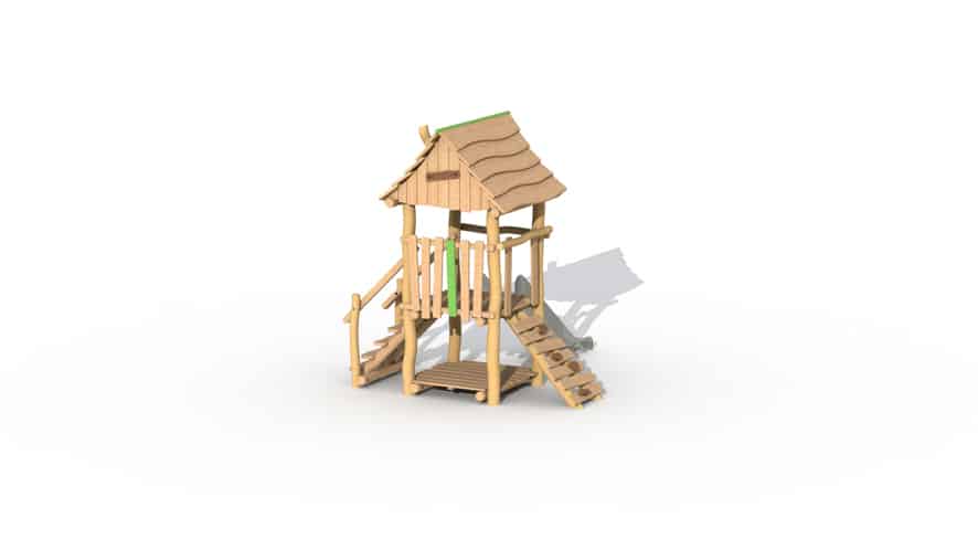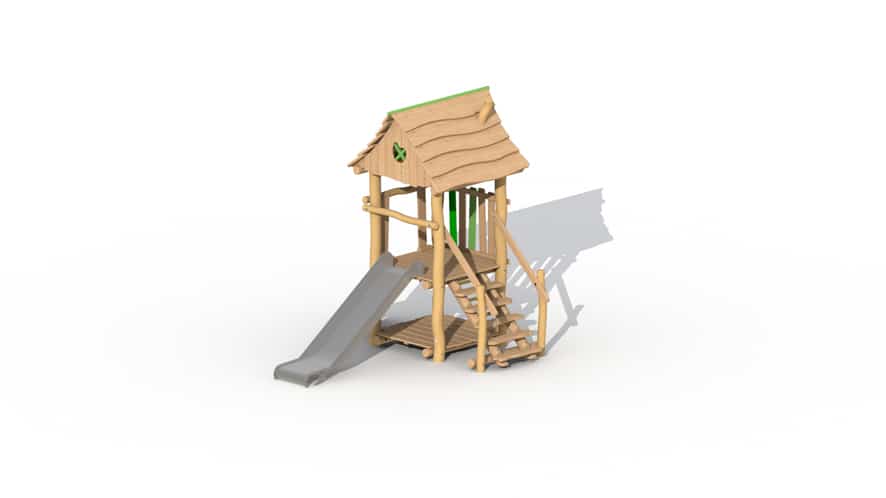 Speeltoestel voor de allerkleinsten, van 2 tot 6 jaar opgebouwd uit lariks en robinia. Het speeltoestel heeft 1 verhoogd platform op een hoogte van 95 cm en een dakje. Het platform kan bereikt worden door middel van een gemakkelijke trap of een klimmuur met padouk klimgrepen, De kinderen kunnen het torentje verlaten via de kunststof glijbaan (beschikbaar in geel of groen). Onderaan is een speelhuisje met vloer voorzien. Door middel van ecologische verf worden groene, speelse accenten aangebracht.