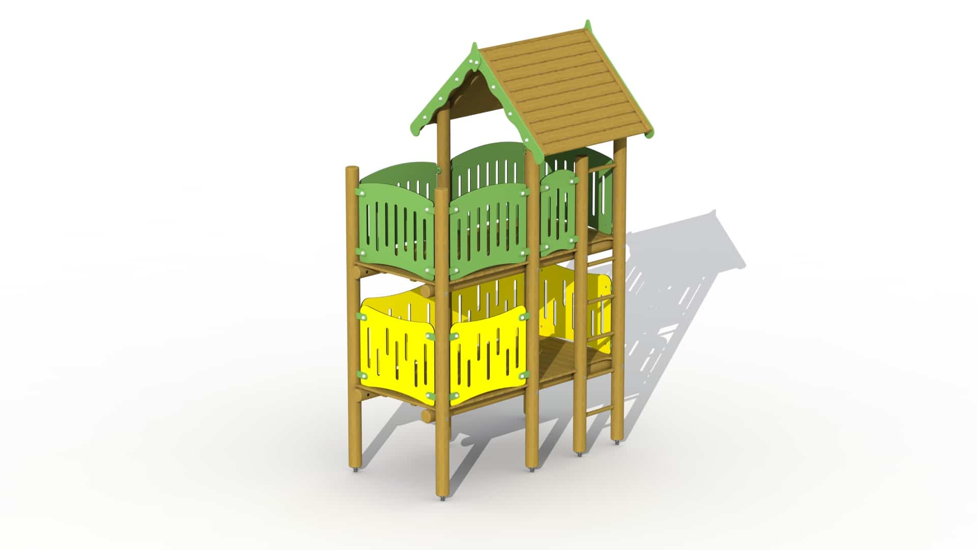 Een hoge klimtoren met twee verdiepingen en bovenop een zadeldak. De platformen zijn te bereiken via een verticale klimladder, geschikt voor kinderen van 6 tot 15 jaar. De toren kan gecombineerd worden met volgende aanbouwelementen: hoge glijstang (S004), hoge spiraalglijstang (S018), hoge inox glijbaan 100 cm breed (G121) en spiraalglijbaan (G402). De rondhouten lariks palen worden met metalen voetsteunen in of op de grond geplaatst. Alle moeren en bouten zijn volledig afgeschermd met bloemvormige afdekdoppen.Er is keuze tussen rode of groene zijwanden op alle structuren!