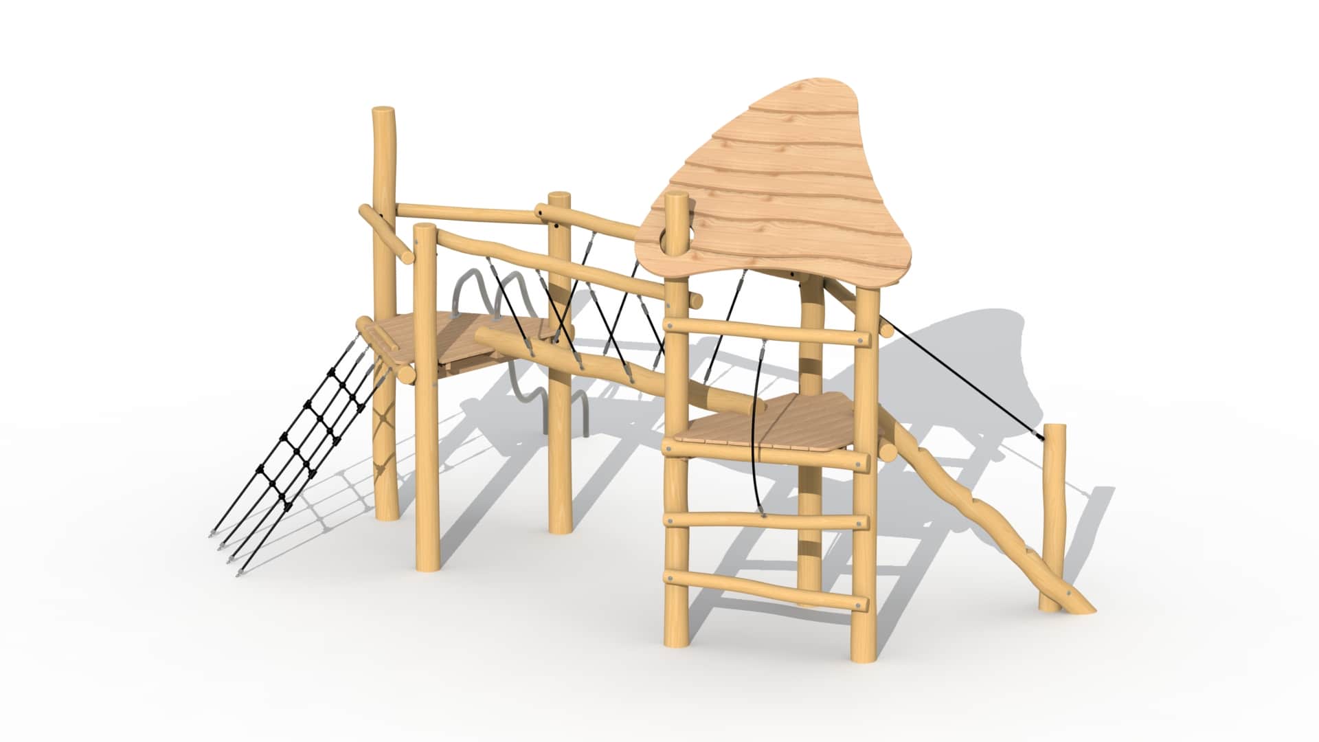 Een combinatie van 2 platformen verbonden door middel van een wiebelende loopbrug voor kinderen vanaf 6 jaar. De vloer- en dakplanken zijn vervaardigd uit lariks hout, de rest van het speeltoestel uit robinia hout. Het toestel kan betreden worden door middel van een klimnet, klimladder of klimtouw (steunend op een schuinliggende rondhout paal). Het speeltoestel kan verlaten worden via 2 glijbuizen uit inox. Alle moeren en bouten zijn volledig afgeschermd. De gehele constructie wordt rechtstreeks met beton in de grond verankerd.