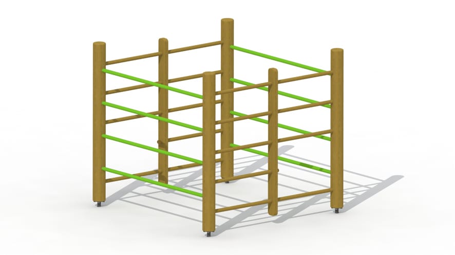 Klimtoestel voor kinderen van 3 tot 10 jaar. Het toestel is opgebouwd in een vierkant waarbij aan 2 zijden een houten klimrek is voorzien en aan de andere 2 zijden een metalen klimrek. De rondhouten lariks palen van diameter 12 cm en buiten het hart gezaagd worden door middel van metalen voetsteunen in de grond geplaatst. Alle metaalonderdelen zijn roestvrij voorbehandeld en polyester gecoat. Alle moeren en bouten zijn volledig afgeschermd met bloemvormige kunststof afdekdoppen.