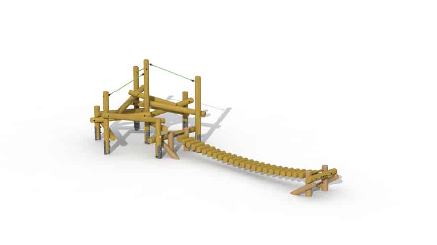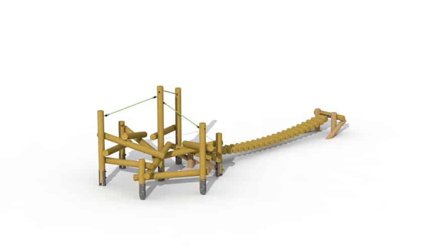 Speeltoestel in de vorm van een mikado waarbij de palen op een speelse manier op elkaar liggen. Dit maakt het extra uitdagend voor de kinderen. De palen met diameter 12cm worden geproduceerd in lariks hout en worden door middel van schelpvormige paalvoeten in de grond geplaatst. Tussen de palen hangen 3 touwen gemaakt uit polypropyleen met staalkabelversterking die de kinderen kunnen helpen om hun evenwicht te bewaren. Aan het mikado spel is een wiebelbrug bevestigd.