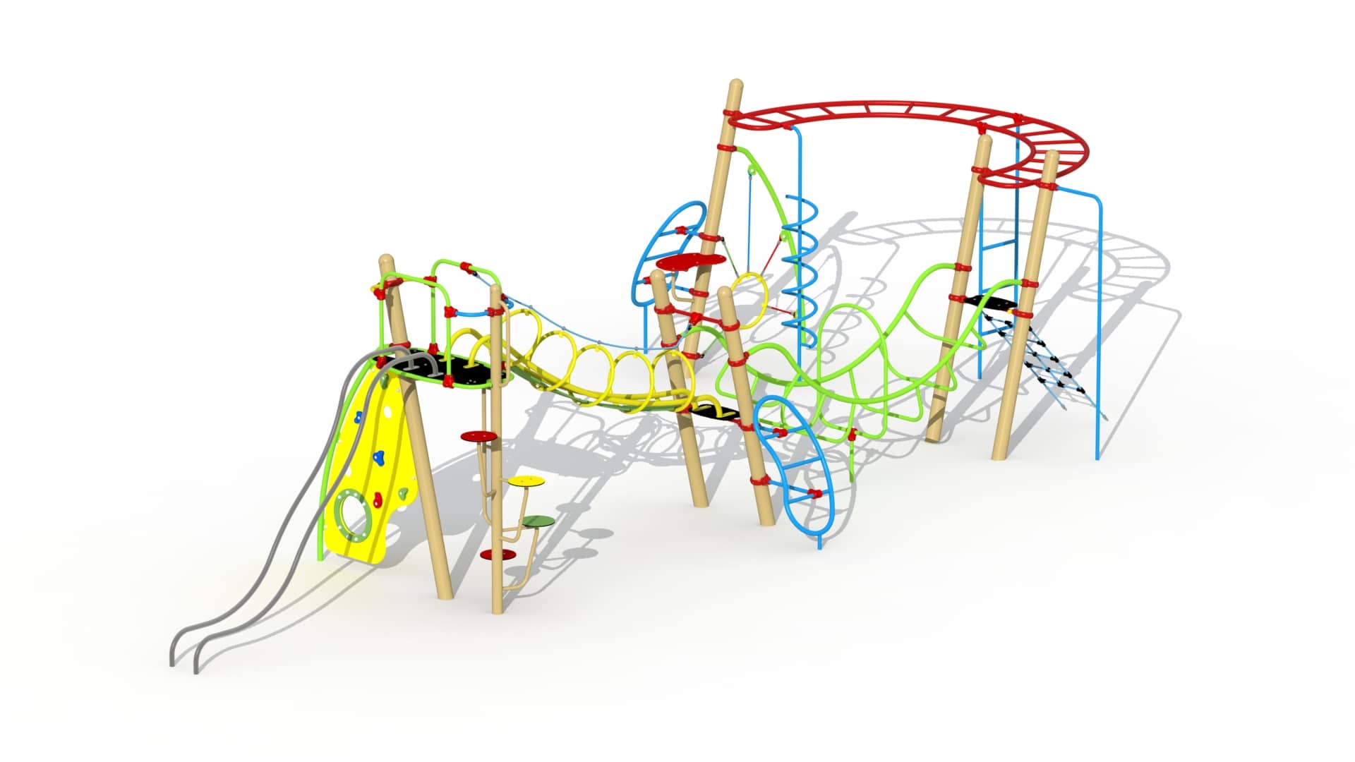 Uitdagend klimtoestel voor kinderen van 6-15 jaar. Het eerste deel bestaat uit diverse schuingeplaatste palen. Een horizontale U-vormige ladder met hangsporten is voorzien van een spiraalglijstang, een rechte glijstang en middenin een sportenladder. Aan de ene zijde van de U-vormige ladder bevindt zich een metalen boonvormige klimladder, een klimring opgespannen aan 16 mm polypropyleen touw met staalkabelversterking en een startplatform uit HDPE polyethyleen. De andere zijde van de U-vormige ladder is opgebouwd uit vier schuingeplaatste palen waaraan diverse klim- en glijelementen bevestigd zitten. Aan de ene zijde is een klimnet bevestigd. Een U-vormige brug met U-treden verbindt de schuingeplaatste palen. Deze palen zijn voorzien van een boonvormige klimladder. Het tweede deel is opgebouwd uit 2 verticale palen met een diameter van respectievelijk 89 en 127mm.