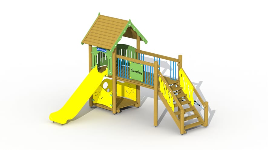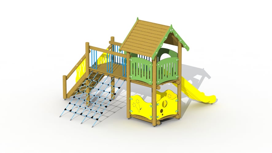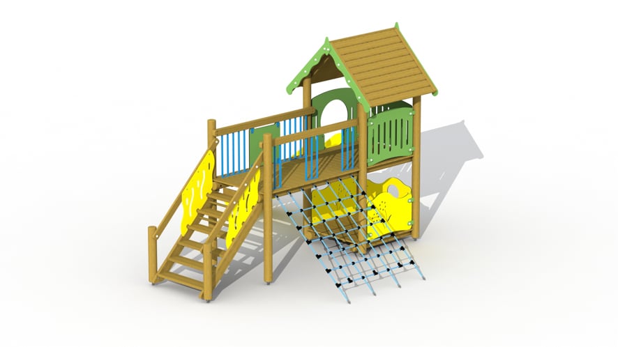 Een toestel met een langwerpig platform dat gedeeltelijk met een zadeldak bedekt is, geschikt voor kinderen van 3 tot 12 jaar. Het platform kan bereikt worden langs een schuingeplaatst klimnet of langs een gemakkelijke trap. Bovenaan kan het platform verlaten worden via een kunststof glijbaan van 0,60 meter breed en onderaan zit een speelhuisje ingewerkt met vloer dat eventueel supplementair kan uitgerust worden met twee zitbankjes en een tafeltje (S001) of een toogje met telraam (S003). Daarnaast zijn ook nog volgende aanbouwelementen mogelijk: klimboog (S006), rotswand (S007), lage glijstang (S008), zandwerkplaats (S009), aanbouwnet (S013), lage spiraalglijstang (S014) en/of spelpanelen (S033-S038). De rondhouten palen worden met metalen voetsteunen in of op de grond geplaatst. Alle metalen onderdelen zijn roestvrij voorbehandeld en alle moeren en bouten zijn volledig afgeschermd met bloemvormige kunststof afdekdoppen.Er is keuze tussen rode of groene zijwanden op alle structuren!