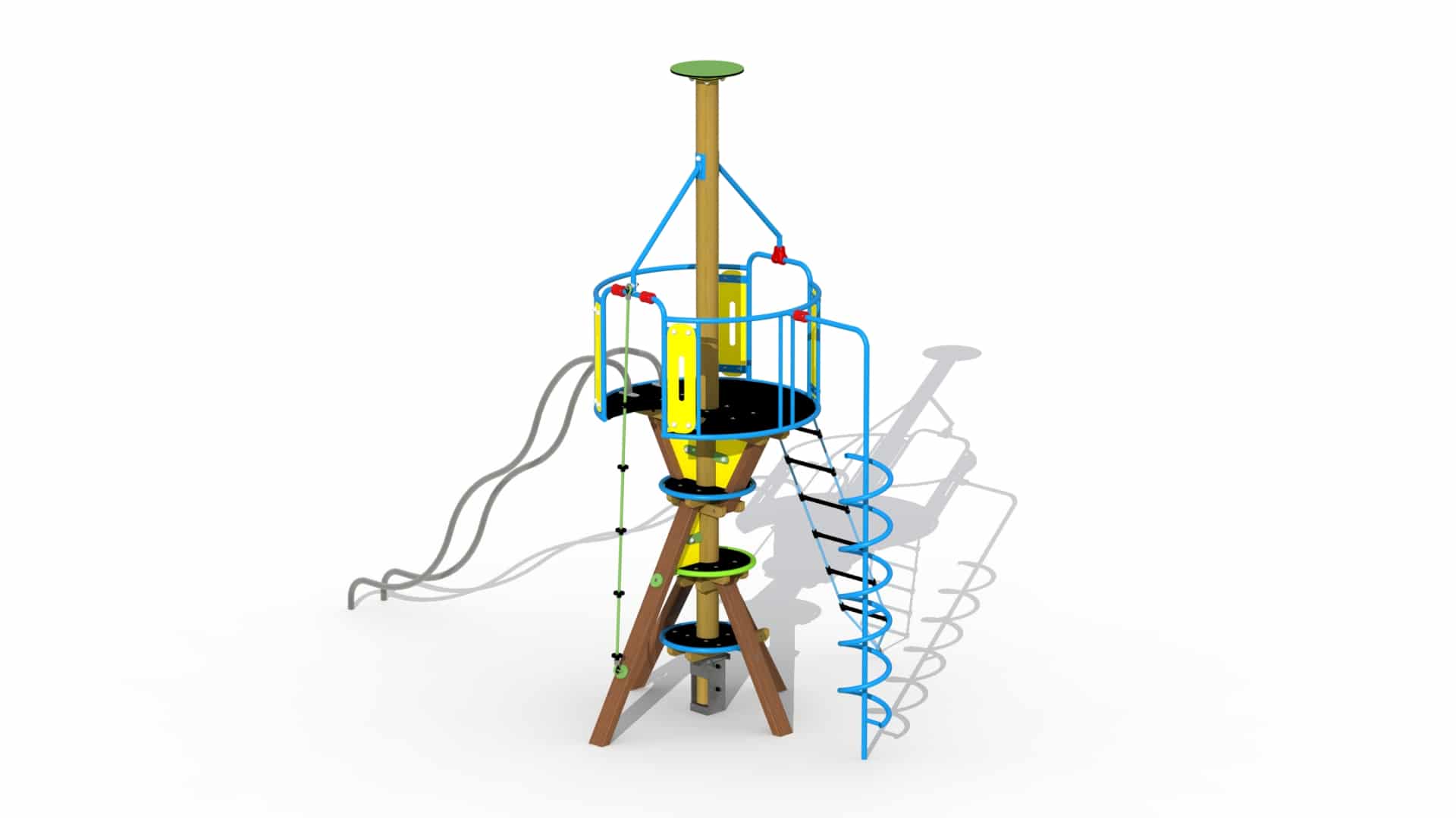 Het ruimteveer is een speeltoestel voor kinderen van 6 tot 15 jaar. Het toestel is opgebouwd rond een centrale, rondhouten paal van 14 cm dikte. Bovenaan is een kleurrijke speelkorf terug te vinden. De speelkorf is te bereiken langs drie zijden. Zo kan je langs de voorzijde via het klimtouw of langs de achterzijde met een touwladder het platform betreden. De spiraal glijstang kan zowel als toegang als uitgang gebruikt worden. Via de inox glijbuizen aan de zijkant kan naar beneden gegleden worden. De volledige korf is voorzien van metaal dat roestvrij voorbehandeld is en gecoat met polyester. Alle kleurrijke kunststof platen bestaan uit HDPE polyethyleen.