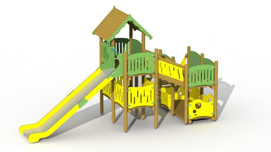 Een twee verdiepingen-hoge klimtoren met zadeldak bovenaan en een hoge inox glijbaan, die verbonden is met een lager gedeelte door middel van een schuin hellende vaste loopbrug. Er is een verticale klimladder aan de hoge toren voorzien en een gemakkelijke trap voor het laagste platform. Onderaan dit lagergelegen platform wordt een speelhuisje ingericht dat eventueel met twee bankjes en een tafeltje (S001), toogje met telraam (S003) of educatieve spelpanelen (S033-S038) kan uitgerust worden. Mits supplement kan een tweede lage glijbaan (inox of kunststof) geplaatst worden. Daarnaast zijn ook nog volgende aanbouwelementen mogelijk: hoge glijstang (S004), apenladder (S005), klimboog (S006), rotswand (S007), lage glijstang (S008), zandwerkplaats (S009), aanbouwnet (S013), lage spiraalglijstang (S014) en/of hoge spiraalglijstang (S018).