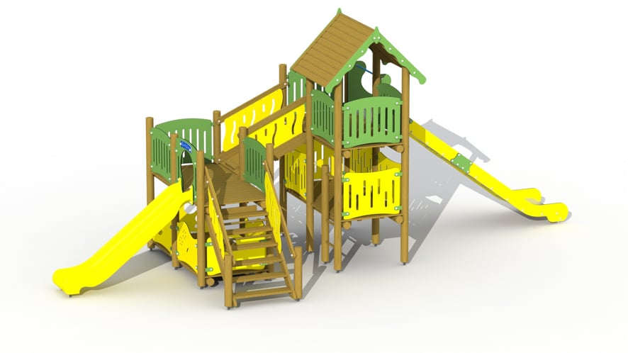 Een twee verdiepingen-hoge klimtoren met zadeldak bovenaan en een hoge inox glijbaan, die verbonden is met een lager gedeelte door middel van een schuin hellende vaste loopbrug. Er is een verticale klimladder aan de hoge toren voorzien en een gemakkelijke trap voor het laagste platform. Aan het laagste platform is een tweede lage kunststof glijbaan voorzien. Onderaan dit lagergelegen platform wordt een speelhuisje ingericht dat eventueel met twee bankjes en een tafeltje (S001), toogje met telraam (S003) of educatieve spelpanelen (S033-S038) kan uitgerust worden. Mits supplement kan een tweede lage glijbaan (inox of kunststof) geplaatst worden. Daarnaast zijn ook nog volgende aanbouwelementen mogelijk: hoge glijstang (S004), apenladder (S005), klimboog (S006), rotswand (S007), lage glijstang (S008), zandwerkplaats (S009), e.d.