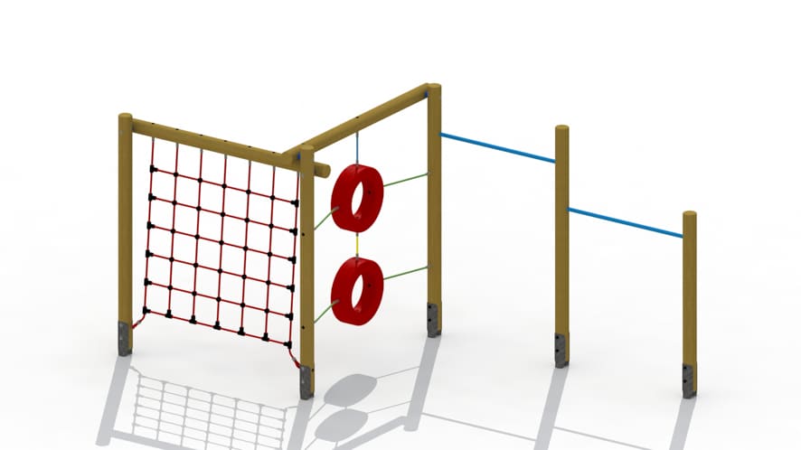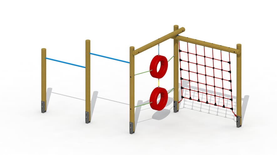 Klimtoestel voor kinderen van 3 tot 10 jaar. Het toestel bestaat uit drie aaneengebouwde delen waarop geklommen kan worden. Het klimtoestel is opgebouwd uit een vijftal verticaal geplaatste lariks palen met een diameter van 12cm, 2 rekstokken op 1.45m en 1.85m hoogte, een klimnet uit 6 ledig staalkabeltouw, een touwladder met essen laddersporten en 2 gekleurde klimbanden opgehangen aan 6-ledig staalkabeltouw. De palen worden door middel van metalen gegalvaniseerde schelpvormige paalvoeten in de grond verankerd. Alle metaalonderdelen zijn roestvrij voorbehandeld en polyester gecoat. Alle moeren en bouten zijn volledig afgeschermd met kunststof afdekdoppen.