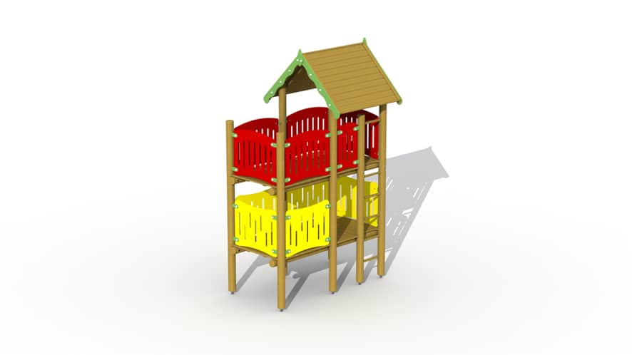 Een hoge klimtoren met twee verdiepingen en bovenop een zadeldak. De platformen zijn te bereiken via een verticale klimladder, geschikt voor kinderen van 6 tot 15 jaar. De toren kan gecombineerd worden met volgende aanbouwelementen: hoge glijstang (S004), hoge spiraalglijstang (S018), hoge inox glijbaan 100 cm breed (G121) en spiraalglijbaan (G402). De rondhouten lariks palen worden met metalen voetsteunen in of op de grond geplaatst. Alle moeren en bouten zijn volledig afgeschermd met bloemvormige afdekdoppen.Er is keuze tussen rode of groene zijwanden op alle structuren!