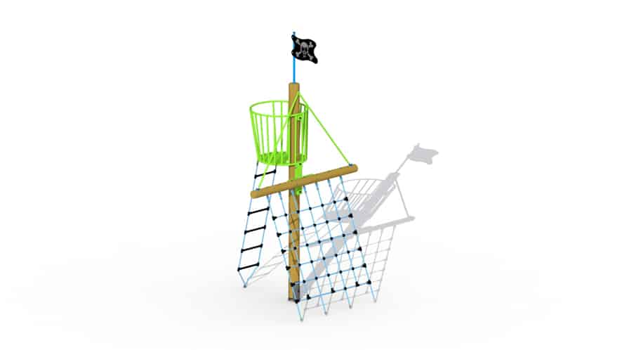 Kraaiennest met klimnet, touwladder en zeeroversvlag voor kinderen van 6 tot 12 jaar. De klimladder aan het kraaiennest heeft ingewerkte sporten uit es van 40 mm. De korf wordt gemaakt met metalen buizen; de kruisverbinding is verstevigd met U-profielen. De verticale rondhouten lariks paal heeft een diameter van 16 cm en wordt met schelpvoet in beton in de grond bevestigd. Alle metaalonderdelen zijn roestvrij voorbehandeld en alle moeren en bouten worden volledig afgedekt met kunststof afdekdoppen.