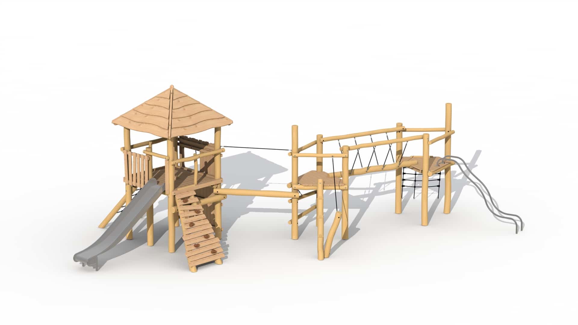 Combinatie van de tovertoren met dak en keverbrugje voor kinderen van 4 tot 12 jaar, met loopbalk. De vloer- en dakplanken, klimmuur en zijwanden zijn vervaardigd uit lariks hout, de rest van het speeltoestel uit robinia hout. De maxi-tovertoren kan bereikt worden langs de tovertoren via klimmuren met klimgrepen uit padouk, klimnetten met touwen in staalkabel en een klimconstructie alsook langs het keverbrugje, bestaande uit rondhouten robinia palen. De maxi-tovertoren kan verlaten worden via een glijbaan uit roestvrij staal of via inox glijbuizen. Alle moeren en bouten zijn volledig afgeschermd. De gehele constructie wordt rechtstreeks met beton in de grond verankerd.