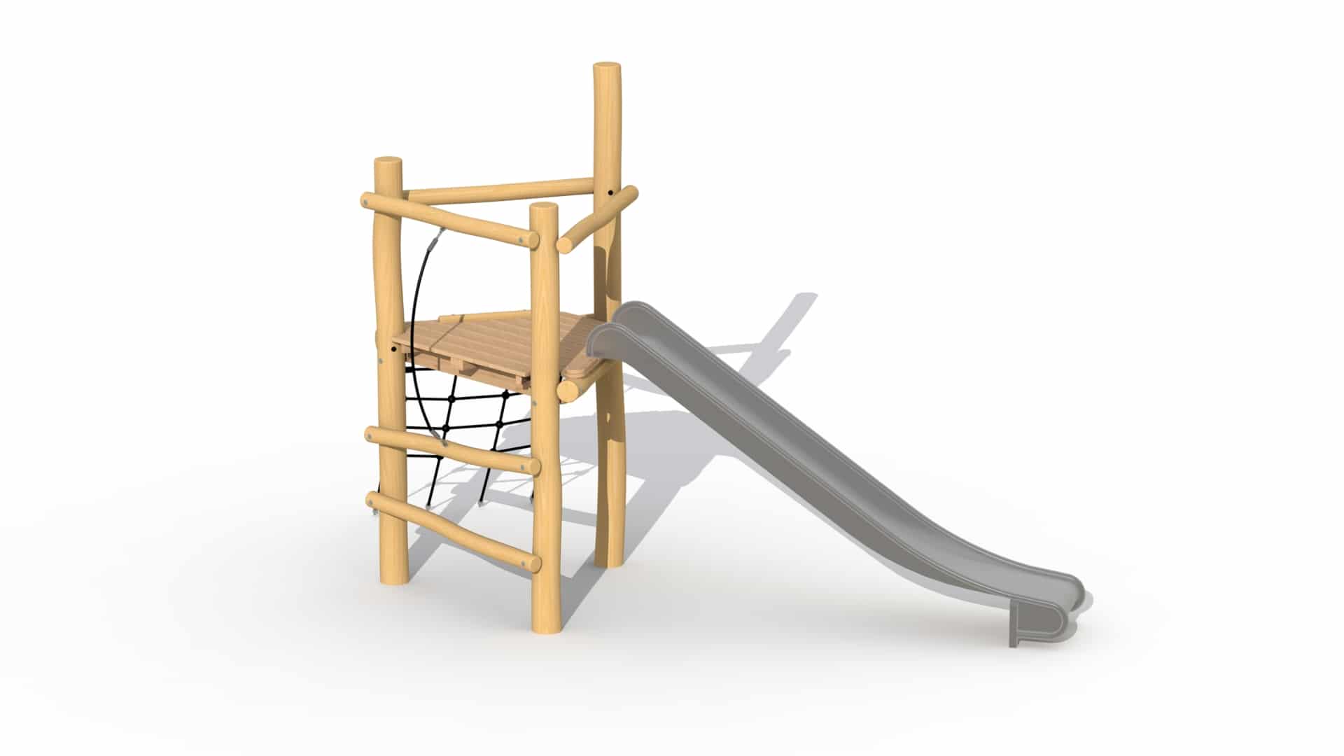 Speeltoren zonder dak en inox glijbaan voor kinderen vanaf 6 jaar. De vloer- en dakplanken zijn vervaardigd uit lariks hout, de rest van het speeltoestel uit robinia hout. De speeltoren kan bereikt worden via een klimnet of een klimtouw en kan verlaten worden via een inox glijbaan. De gehele constructie wordt rechtstreeks met beton in de grond verankerd.