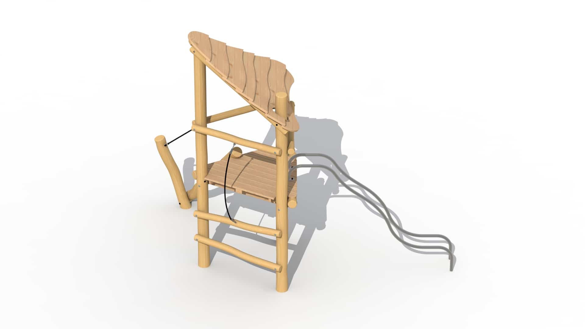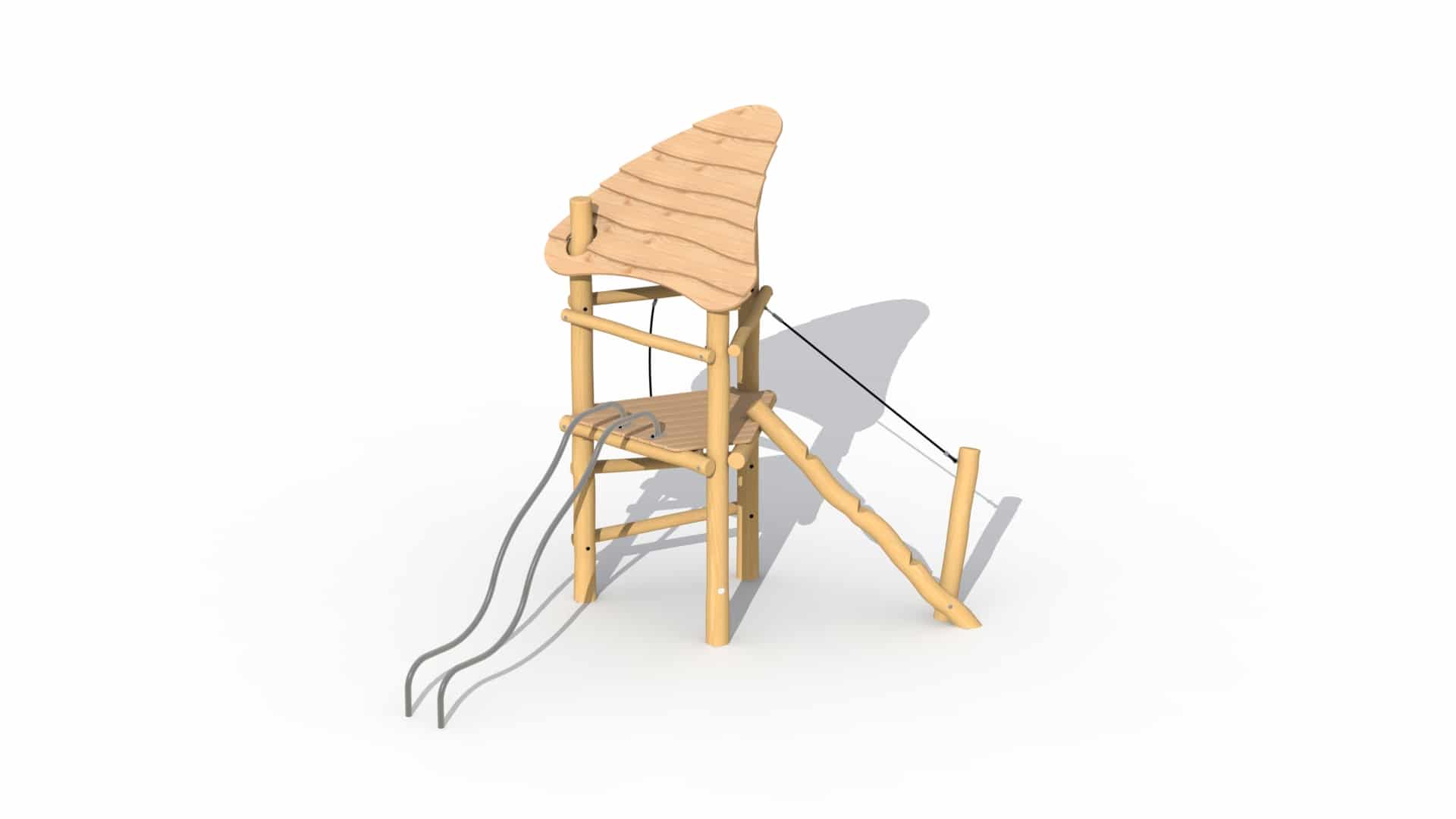 Speeltoren met dak en inox glijbuizen voor kinderen vanaf 6 jaar. De vloer- en dakplanken zijn vervaardigd uit lariks hout, de rest van het speeltoestel uit robinia hout. De speeltoren kan bereikt worden via een klimnet of klimtouw en kan verlaten worden via inox glijbuizen. De gehele constructie wordt rechtstreeks met beton in de grond verankerd.