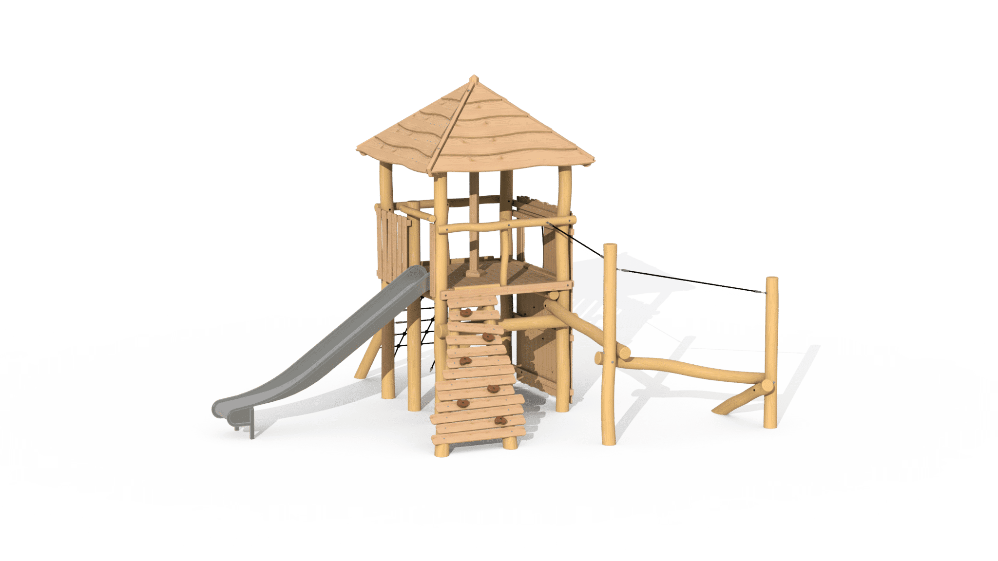 Speeltoren met 1 platform voor kinderen van 4 tot 12 jaar. De vloer- en dakplanken, klimmuur en zijwanden zijn vervaardigd uit lariks hout, de rest van het speeltoestel uit robinia hout. De speeltoren kan bereikt worden via 2 klimmuren met klimgrepen uit padouk, een klimnet en een klimconstructie bestaande uit rondhouten palen en touwen in staalkabel. De speeltoren kan verlaten worden via een glijbaan uit roestvrij staal. Alle moeren en bouten zijn volledig afgeschermd. De gehele constructie wordt rechtstreeks met beton in de grond verankerd.