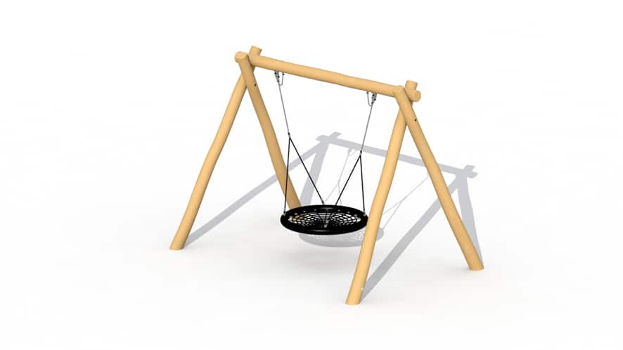 Houten vogelnestschommel voor kinderen van 3 tot 15 jaar. De schommel is opgebouwd uit robinia hout met 4 staanders en een horizontale ligger. Een schommelkorf met diameter 125 cm en opgebouwd uit zes-ledig staalkabeltouw wordt aan de onderhoudsvrije schommelhaken met dubbele ophanging bevestigd via een staalkabeltouw. De schommel wordt rechtstreeks met beton in de grond verankerd. Deze schommel is eveneens geschikt voor kinderen en volwassenen met een beperking.Standaardkleur van de schommelkorf: zwart/blauw.