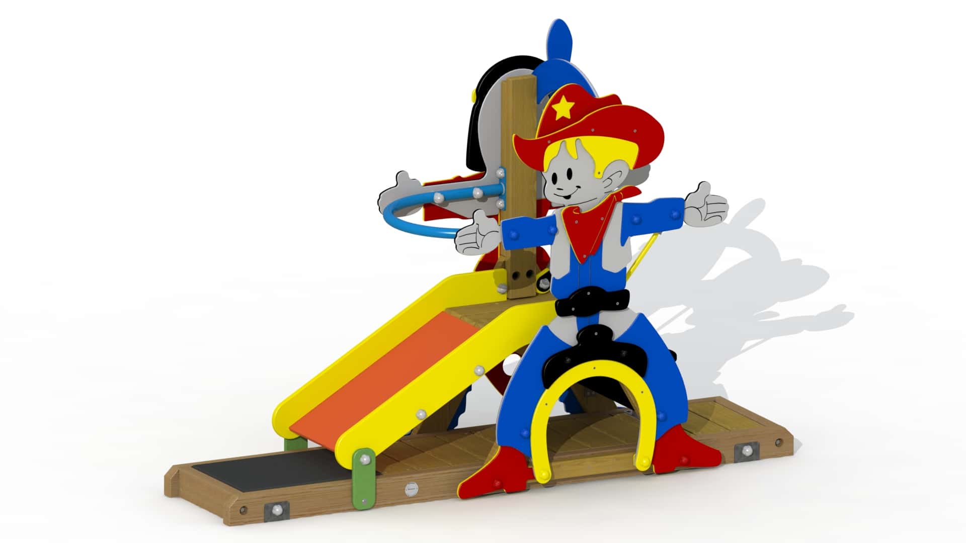 Vrijstaand kleurrijk speeltoestel voor kinderen van 1 tot 3 jaar. Het toestel heeft twee zijden uit HDPE polyethyleen. De loopwand heeft twee zijden uit HDPE polyethyleen in de vorm van een Cowboy en een Indiaan. Het toestel is beklimbaar via een trap, vervaardigd met kunststof treden. Alle metaalonderdelen zijn roestvrij voorbehandeld en alle moeren en bouten zijn volledig afgeschermd met kunststof bloemvormige afdekdoppen. Dit avontuurlijk toestel biedt kinderen diverse speelwaarden aan. De kinderen kunnen naar hartelust naar beneden glijden en zetten dankzij het kindvriendelijke trapje of de loopwand hun eerste stapjes om te leren klimmen. De echte avonturiers kunnen hun weg onderaan verderzetten via de doorkruiptunnel.
