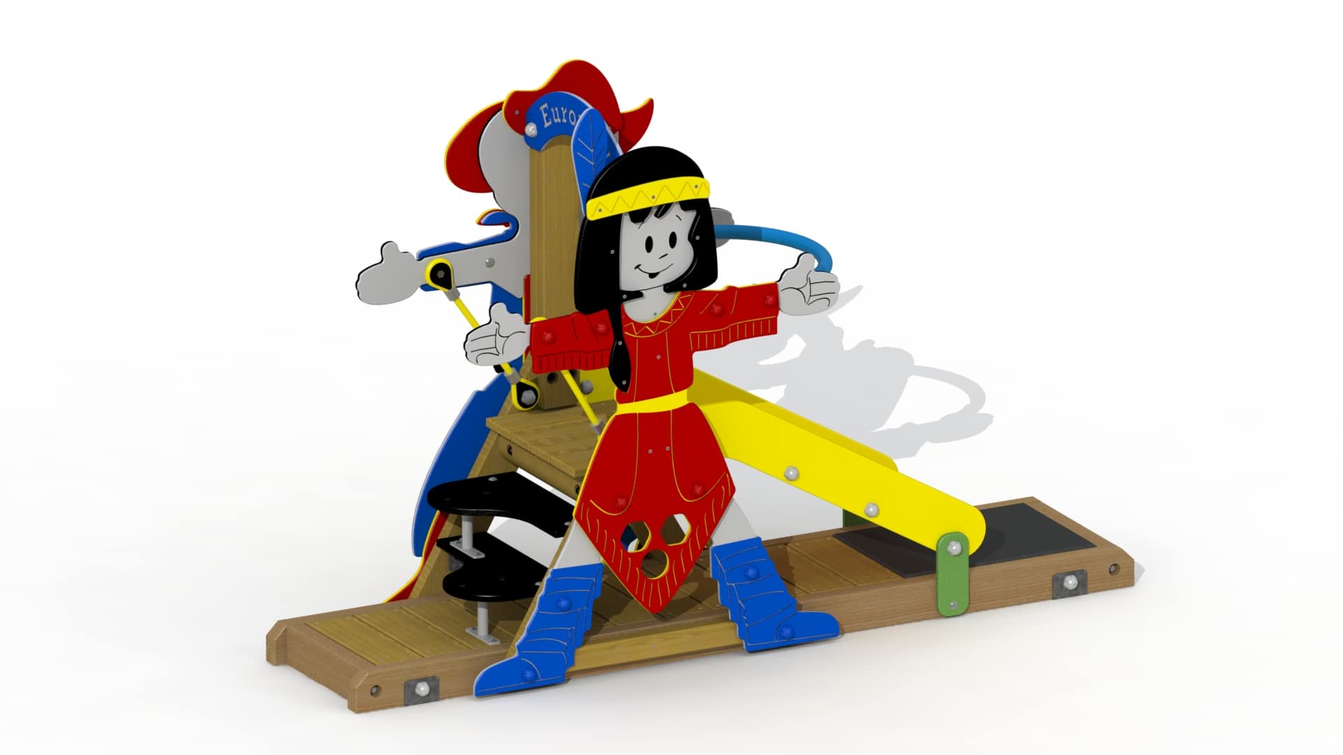 Vrijstaand kleurrijk speeltoestel voor kinderen van 1 tot 3 jaar. Het toestel heeft twee zijden uit HDPE polyethyleen. De loopwand heeft twee zijden uit HDPE polyethyleen in de vorm van een Cowboy en een Indiaan. Het toestel is beklimbaar via een trap, vervaardigd met kunststof treden. Alle metaalonderdelen zijn roestvrij voorbehandeld en alle moeren en bouten zijn volledig afgeschermd met kunststof bloemvormige afdekdoppen. Dit avontuurlijk toestel biedt kinderen diverse speelwaarden aan. De kinderen kunnen naar hartelust naar beneden glijden en zetten dankzij het kindvriendelijke trapje of de loopwand hun eerste stapjes om te leren klimmen. De echte avonturiers kunnen hun weg onderaan verderzetten via de doorkruiptunnel.