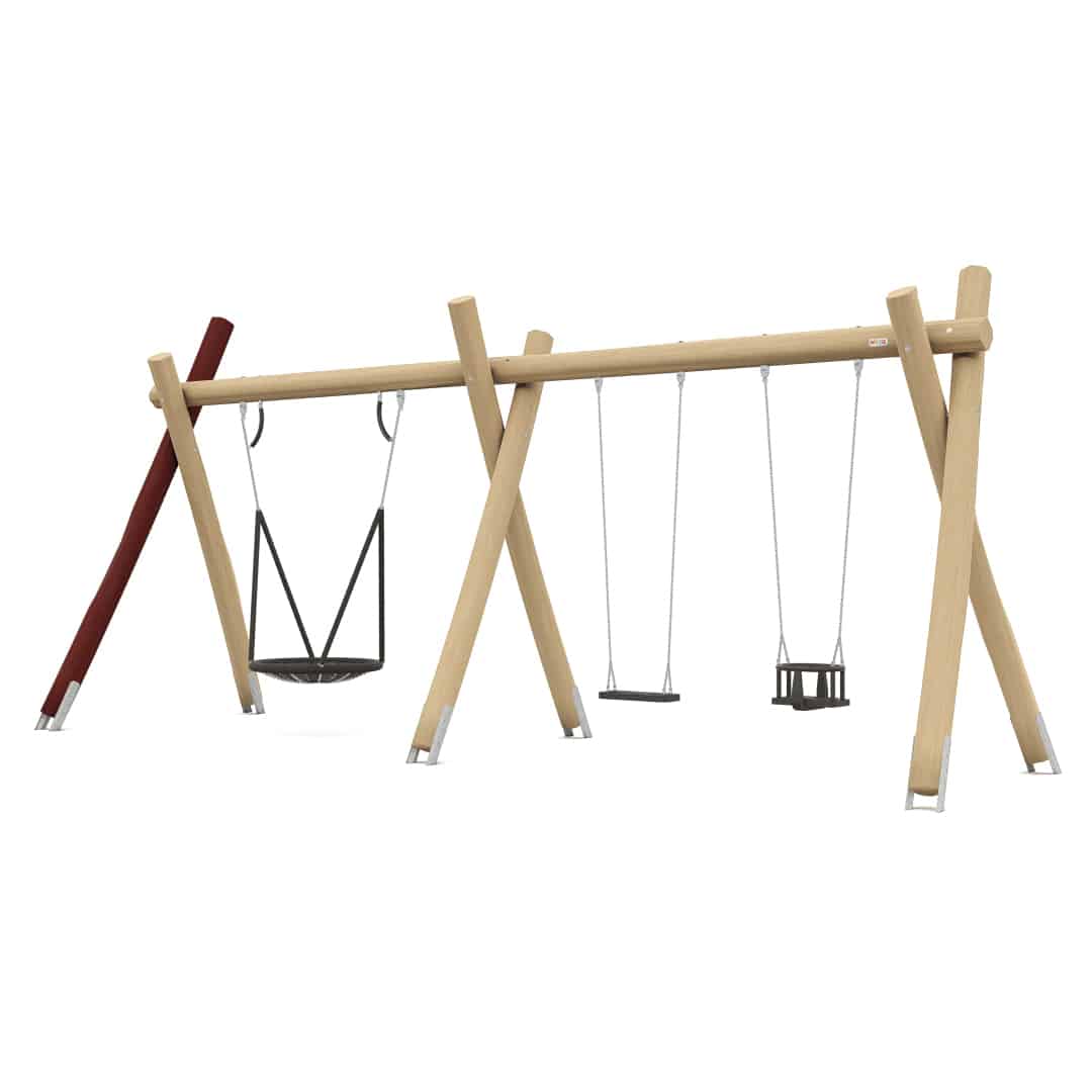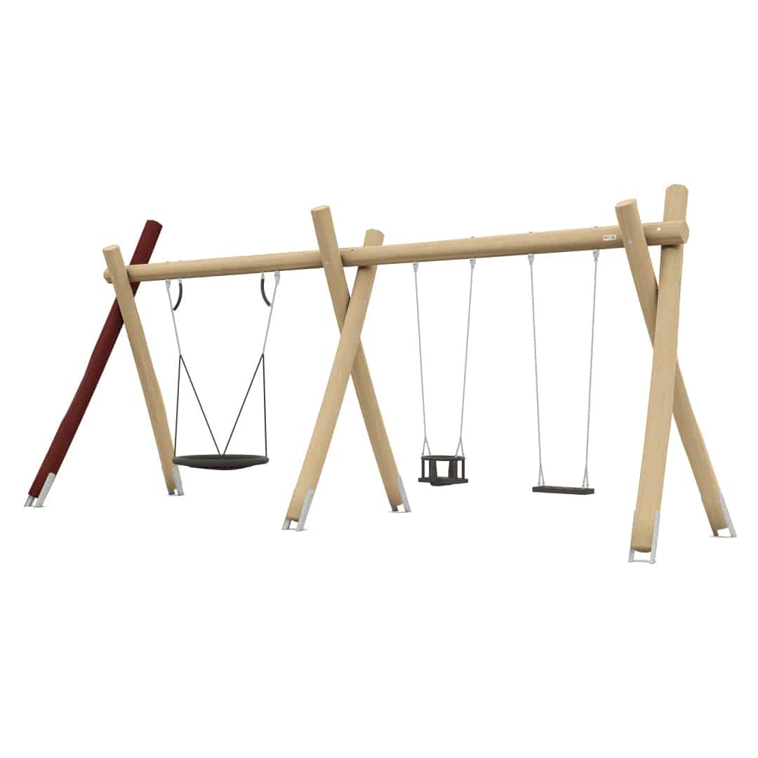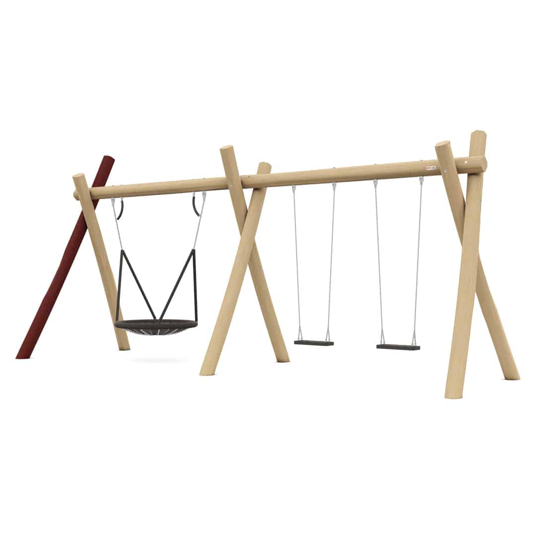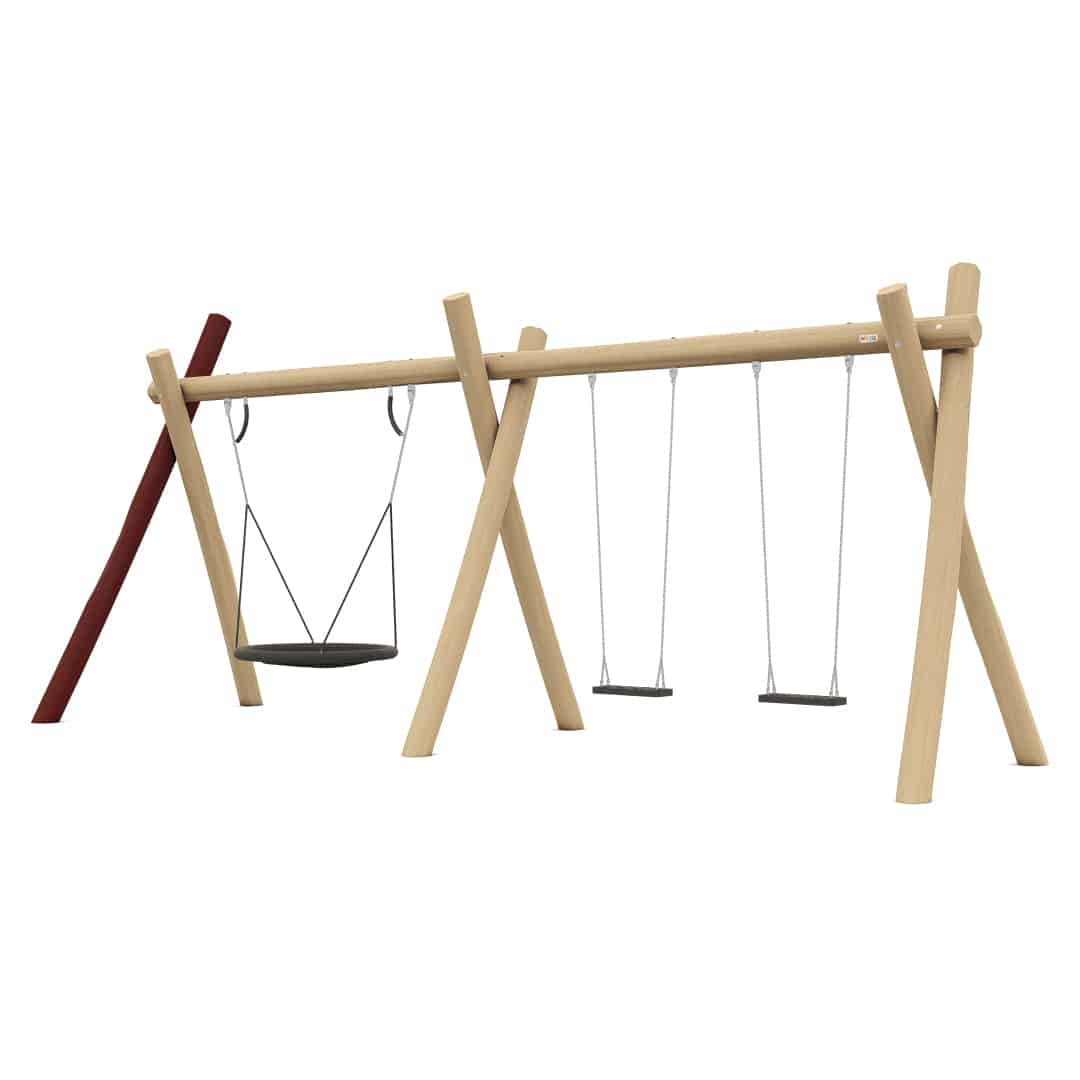 Robinia schommel met 1 vogelnestmand en 2 vlakke zittingen om op te schommelen. Deze schommel is voorzien van extra dikke Robinia palen. Leverbaar in een versie met en zonder verzinkte grondankers, voor een langere levensduur.