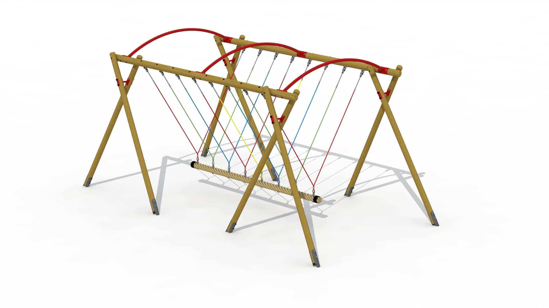 Houten schommel voor kinderen van 3 tot 15 jaar. De schommel is opgebouwd uit 8 staanders lariks hout met een diameter van 12 cm en 2 horizontale liggers lariks hout met diameter van 14 cm. De schommel is in de hoeken verstevigd met rode polyestergecoate stalen steunbeugels met een diameter van 60mm. Het schommeltouw wordt door middel van kleurrijke touwen in staalkabel met op het einde gegalvaniseerde kettingen, bevestigd aan onderhoudsvrije schommelhaken. De schommel is onderaan voorzien van metalen gegalvaniseerde schelpvormige paalvoeten die met beton in de grond verankerd worden.