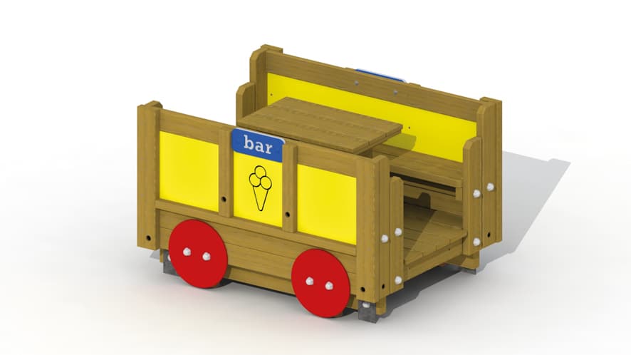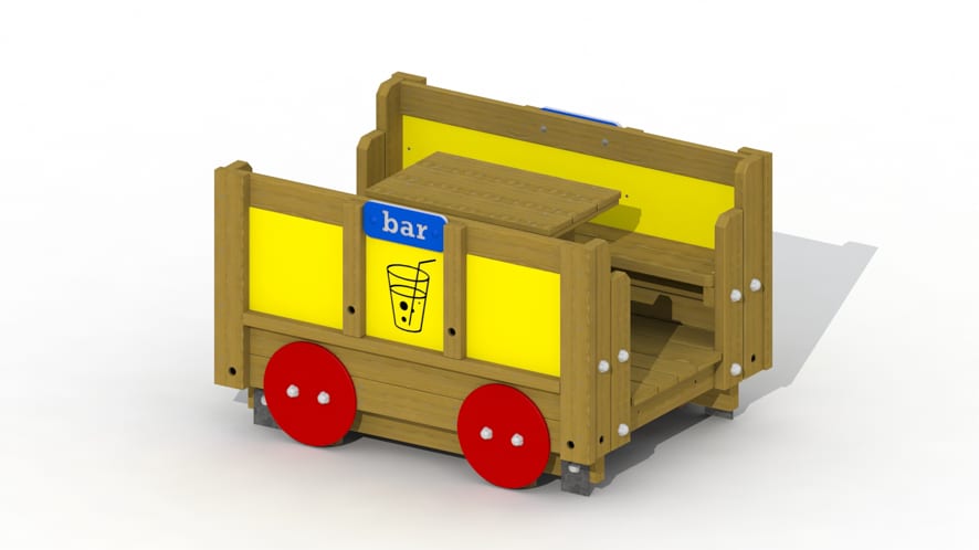 Eetwagon van de trein met twee bankjes en een tafeltje. De bovenconstructie van de eetwagon is volledig uitgevoerd in lariks, de onderconstructie in eik. Deze wagon wordt voorgemonteerd geleverd. Door middel van een verbindingsbruggetje (T500) kan dit speeltoestel verbonden worden…
