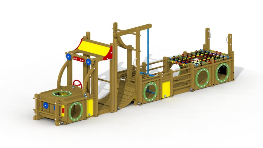 Een speeltoestel in de vorm van een truck voor kinderen van 2 tot 6 jaar. Dit speeltoestel omvat een veelvoud aan speelmogelijkheden (o.a. een klauternet en een glijstang). De bovenconstructie is volledig uitgevoerd in lariks, de onderste liggers zijn uitgevoerd…