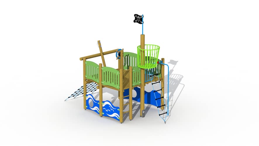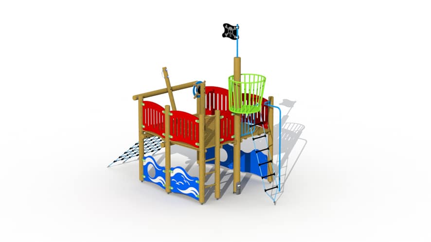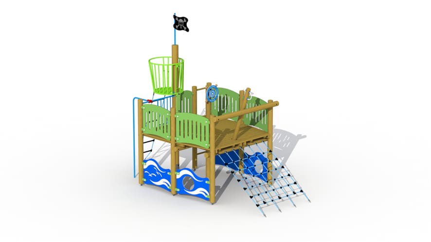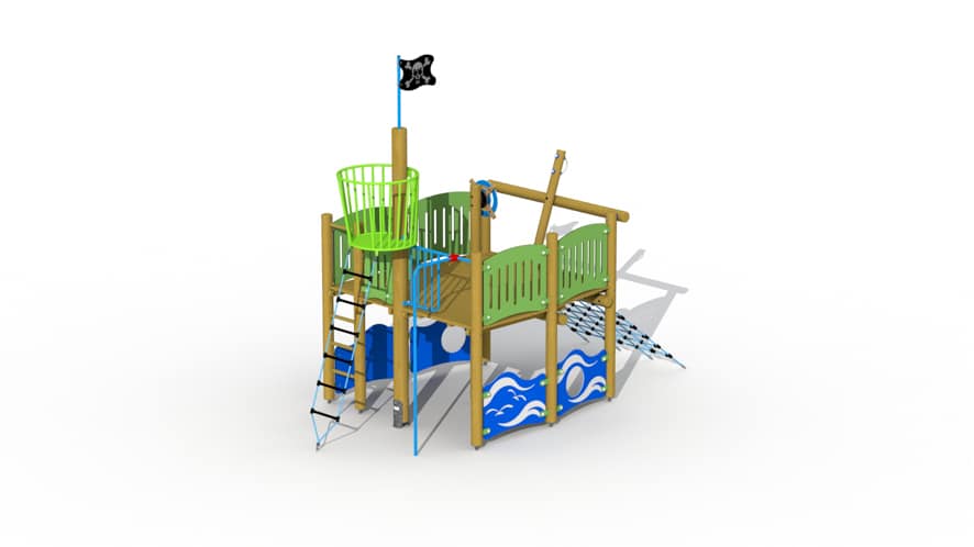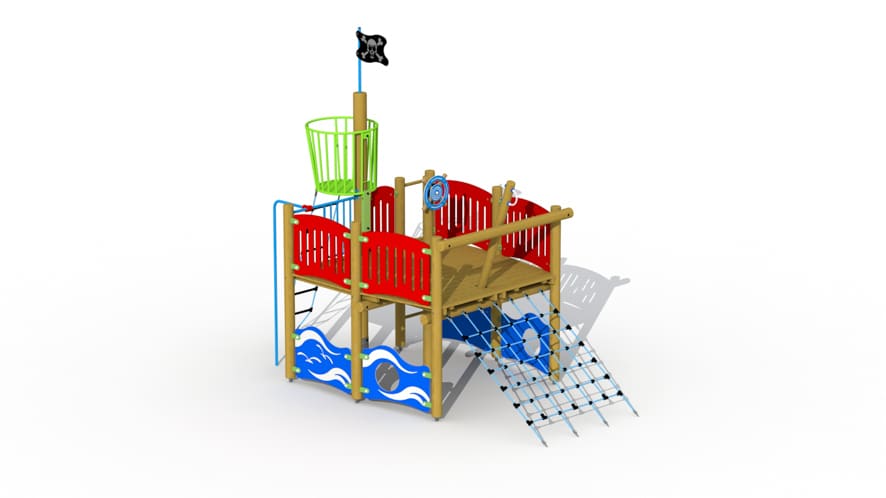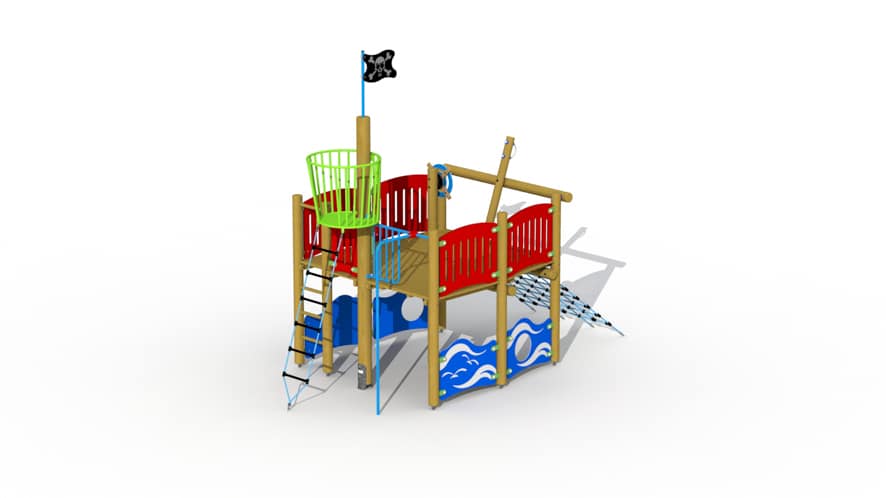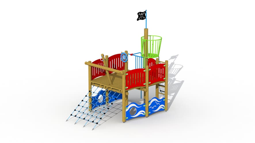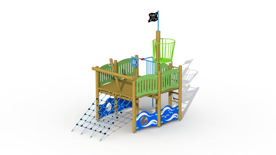 Een speeltoestel in de vorm van een vikingschip opgebouwd in twee delen voor kinderen van 4 tot 12 jaar. De achtersteven (ref. U200) is opgebouwd uit een stuurwiel uit HDPE polyethyleen, een klimmast met kraaiennest en zeeroversvlag, een glijstang, een…