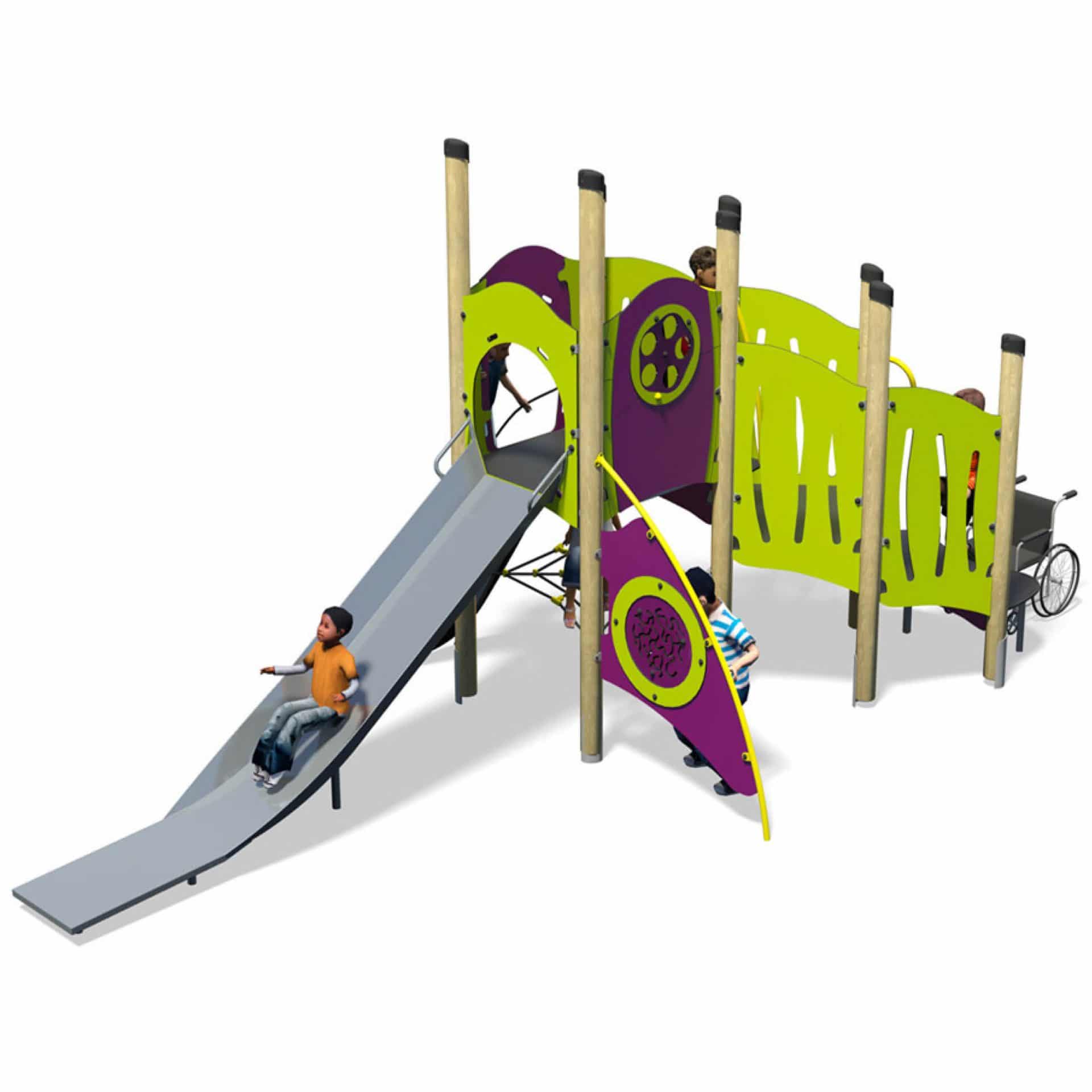 De Mambo Plus bestaat uit een vierkante toren (1,5m), een glijbaan (1,5m), touwwand (1,5m), een toegang voor minder validen en twee spelpanelen. Op dit toestel kan geklommen en gegleden worden, wat bijdraagt aan de ontwikkeling van balans, klimvaardigheden en de…