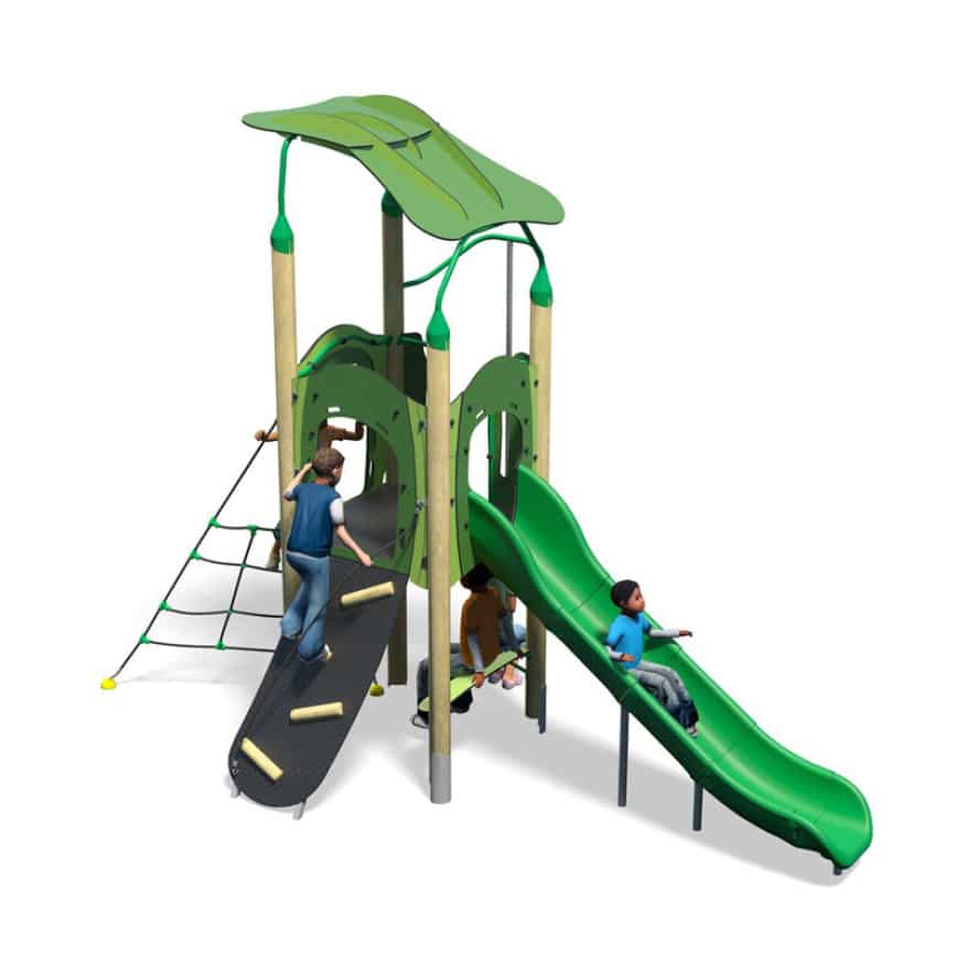 De Shimmy Plus bestaat uit een glijbaan, een brandweerman paal, een klimnet, een bankje en een rotswand. Het toestel is dus voorzien van allerlei activiteiten. Deze dragen bij aan de ontwikkeling op sociaal gebied, klimvaardigheden, het inschattingsvermogen van risico’s.