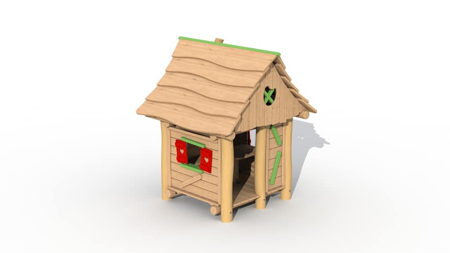 Speeltoestel voor de allerkleinsten, van 2 tot 6 jaar opgebouwd uit lariks en robinia. Het huisje is binnenin voorzien twee zitbankjes en een tafeltje en heeft 2 raampjes waardoor de kinderen in het huisje interactie kunnen hebben met de kinderen buiten het huisje. De raampjes zorgen er ook voor dat de kleintjes altijd in het zicht zijn van de volwassenen. Het houthakkershutje wordt voorgemonteerd geleverd en heeft door de lage valhoogte geen valdemping nodig.