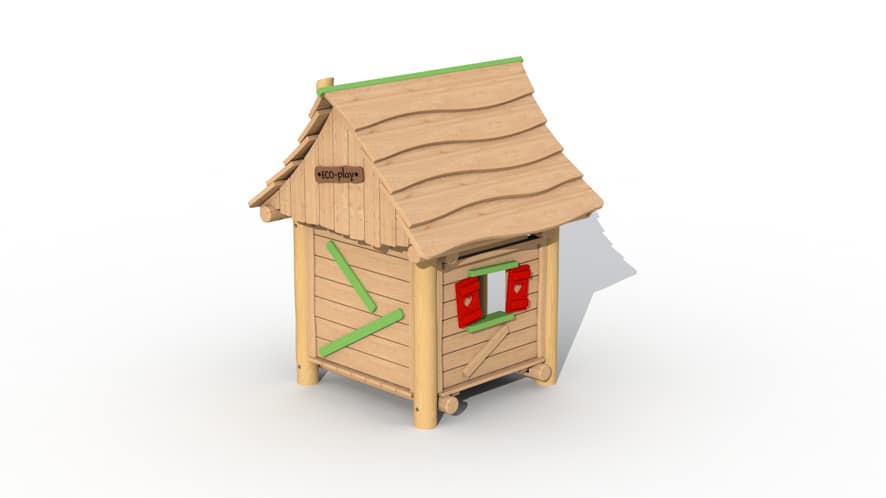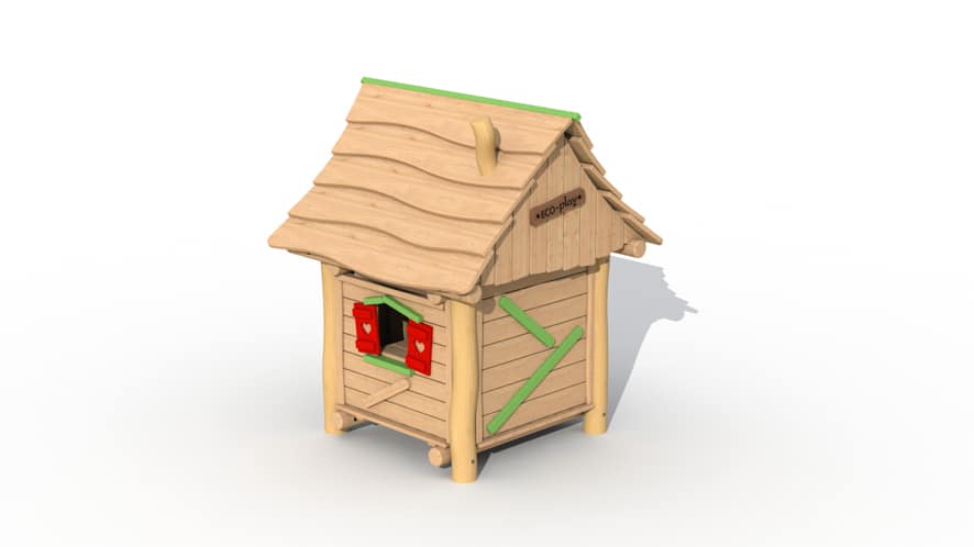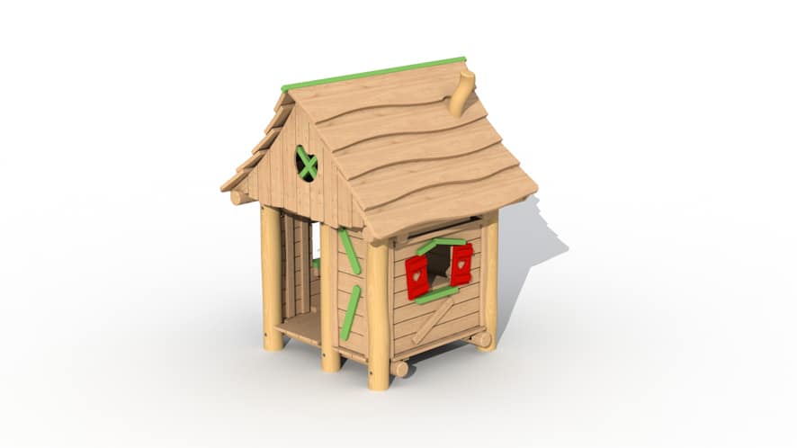 Speeltoestel voor de allerkleinsten, van 2 tot 6 jaar opgebouwd uit lariks en robinia. Het huisje is binnenin voorzien twee zitbankjes en een tafeltje en heeft 2 raampjes waardoor de kinderen in het huisje interactie kunnen hebben met de kinderen buiten het huisje. De raampjes zorgen er ook voor dat de kleintjes altijd in het zicht zijn van de volwassenen. Het houthakkershutje wordt voorgemonteerd geleverd en heeft door de lage valhoogte geen valdemping nodig.