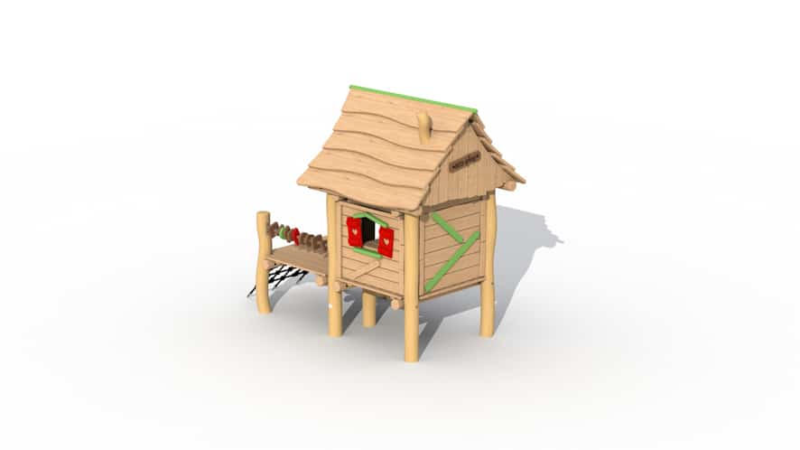 Speeltoestel voor de allerkleinsten, van 2 tot 6 jaar opgebouwd uit lariks en robinia. Het speeltoestel bestaat uit een verhoogd huisje dat te bereiken is door middel van een klimnet en stappaaltjes. Het huisje is voorzien van een leuk terrasje waarop de kinderen op uitkijk kunnen staan. Aan het terrasje is ook een telraam aanwezig. Het huisje zelf heeft 2 raampjes waardoor ouders de kinderen wel nog altijd kunnen zien. In het huisje is een tafeltje met bankjes aanwezig.