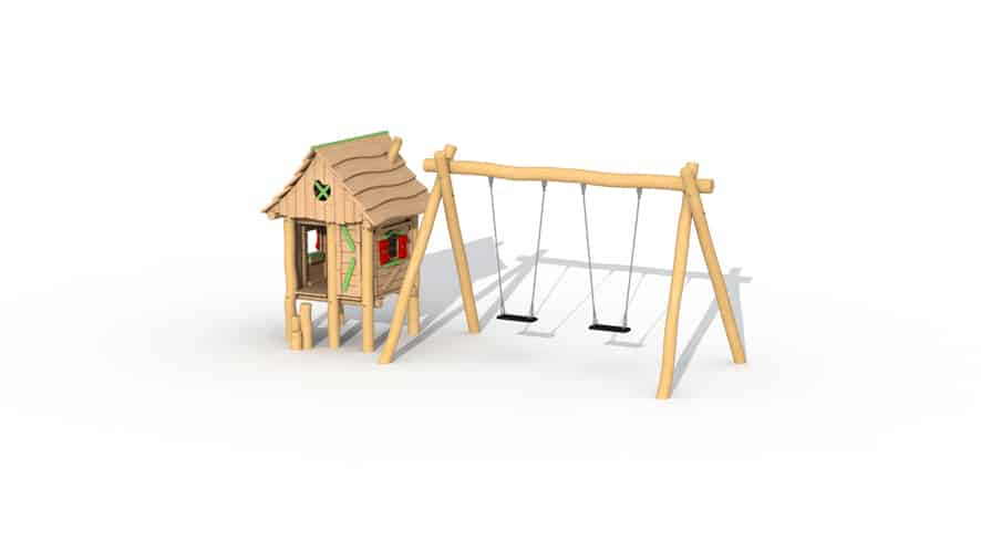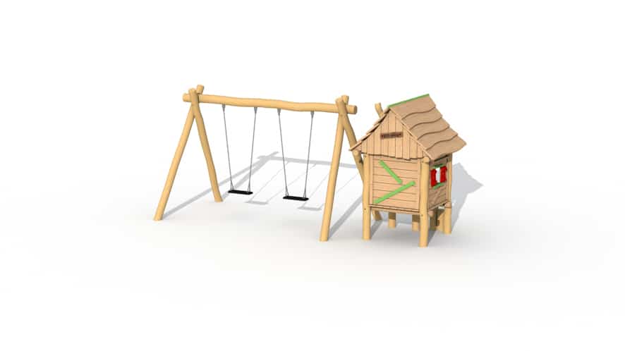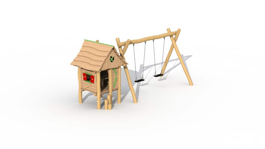 Het speeltoestel bestaat uit een verhoogd huisje dat te bereiken is door middel van stappaaltjes. Deze stappaaltjes zorgen voor wat meer uitdaging voor de iets oudere kleutertjes. Het huisje is binnenin voorzien twee zitbankjes en een tafeltje en heeft 2 raampjes waardoor de kinderen in het huisje interactie kunnen hebben met de kinderen buiten het huisje. De raampjes zorgen er ook voor dat de kleintjes altijd in het zicht zijn van de volwassenen. De schommel is opgebouwd uit 4 staanders robinia hout met een diameter van 13 cm en een horizontale ligger robinia hout met diameter van 15cm.