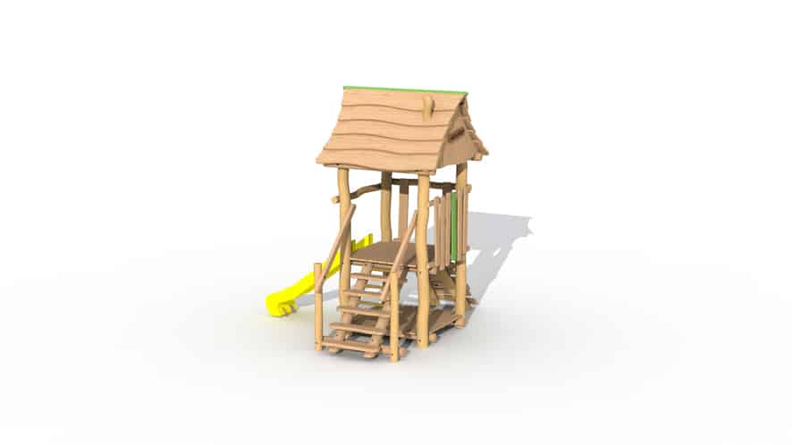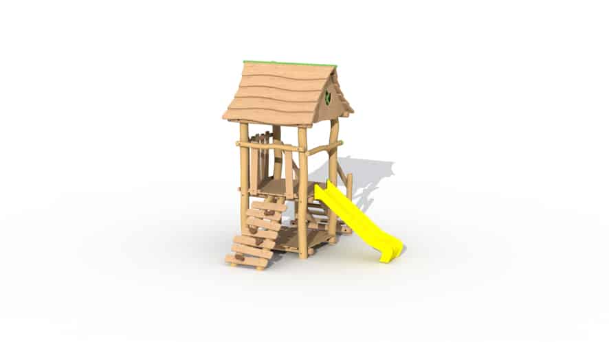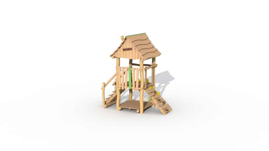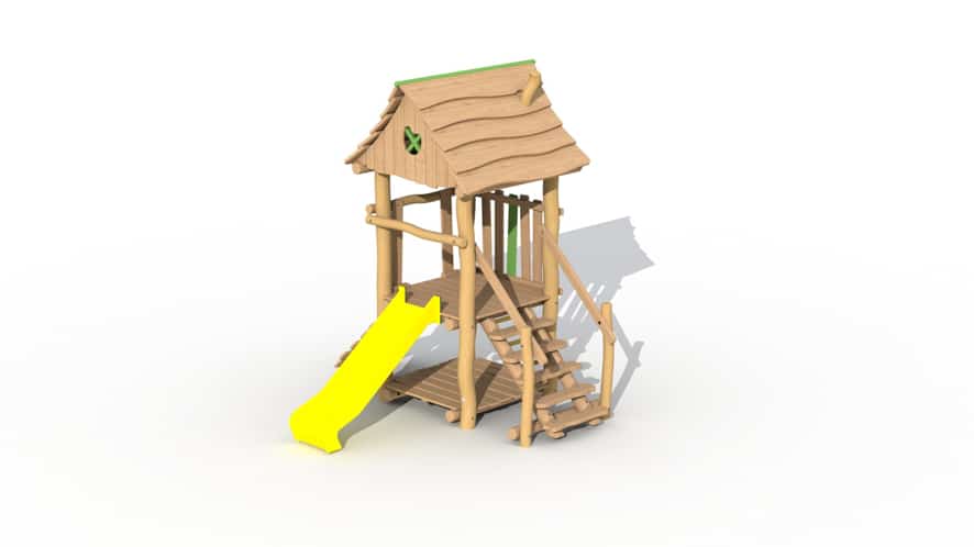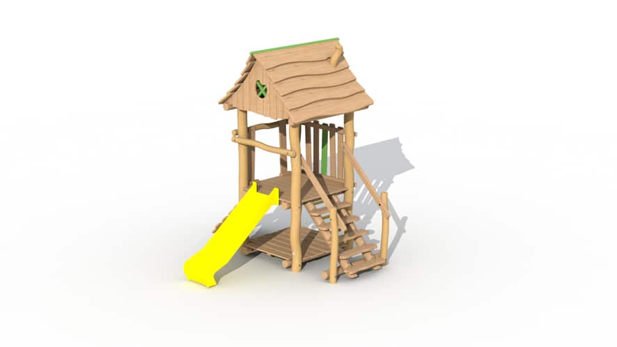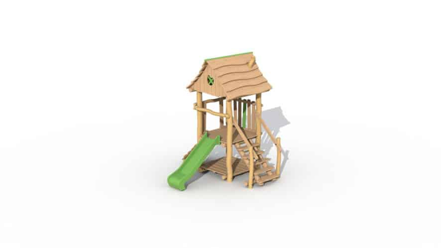 Speeltoestel voor de allerkleinsten, van 2 tot 6 jaar opgebouwd uit lariks en robinia. Het speeltoestel heeft 1 verhoogd platform op een hoogte van 95 cm en een dakje. Het platform kan bereikt worden door middel van een gemakkelijke trap of een klimmuur met padouk klimgrepen, De kinderen kunnen het torentje verlaten via de kunststof glijbaan (beschikbaar in geel of groen). Onderaan is een speelhuisje met vloer voorzien. Door middel van ecologische verf worden groene, speelse accenten aangebracht.