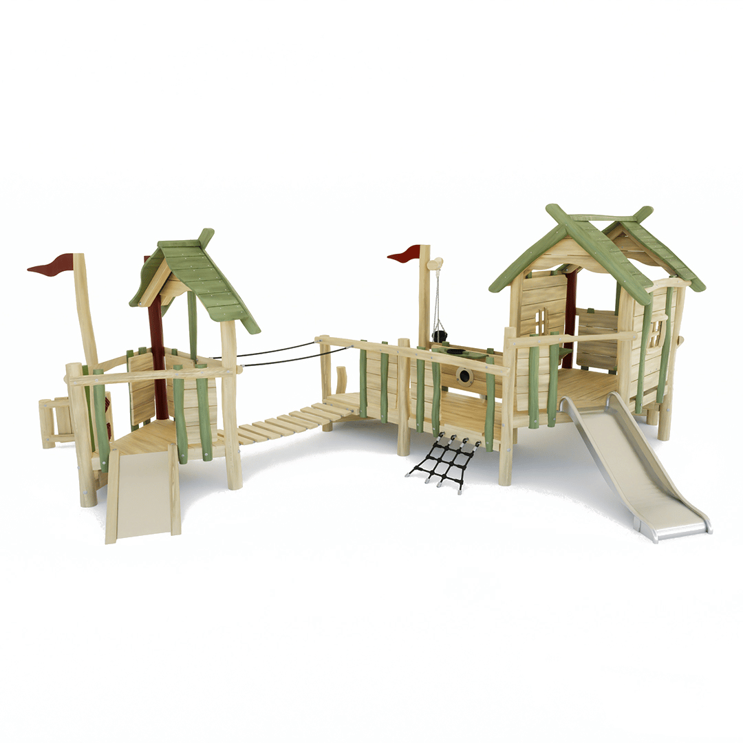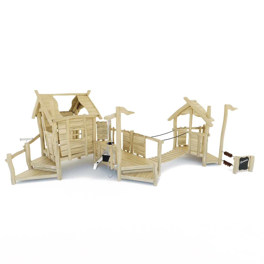 Uitdagend Robinia kleuterdorp Burcht met veel verschillende speelwaarden. Zoals een wiebelbrug, plateaus op verschillende hoogtes, een speelhuisje, een verrekijker en een zandkraan en nog veel meer.