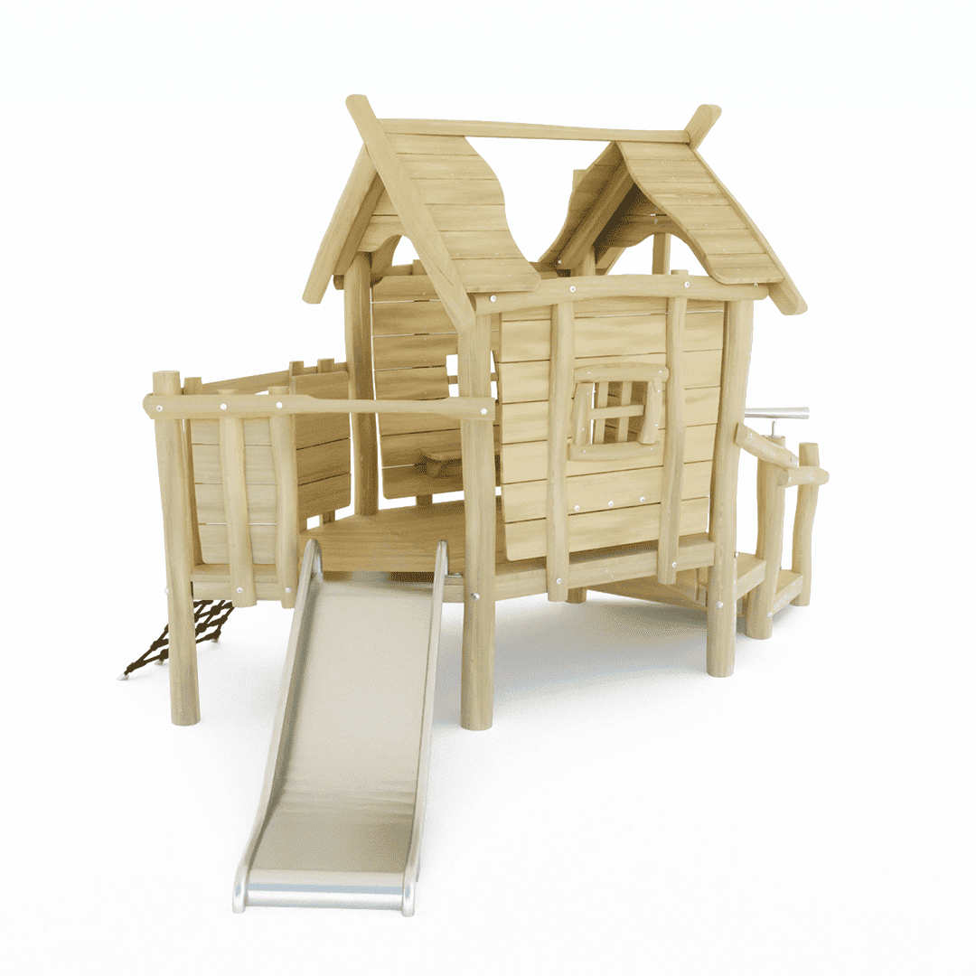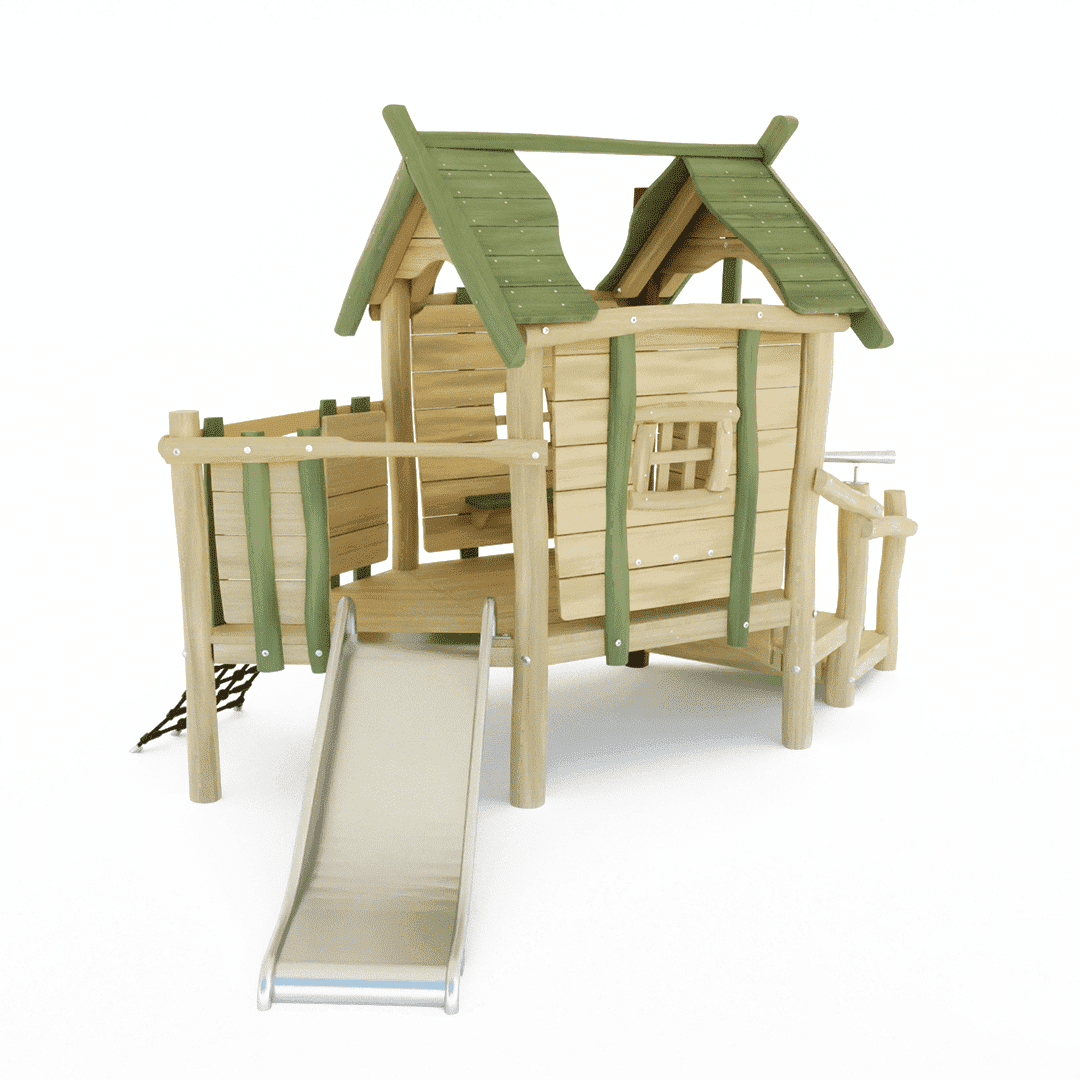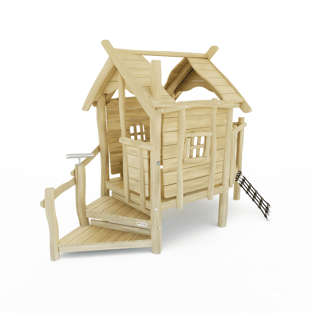 Het Robinia speelhuis met een trap als oploop, een schuinstaand klimnet, een verrekijker en natuurlijk het leuke huis om samen met je vriendjes / vriendinnetjes te spelen.