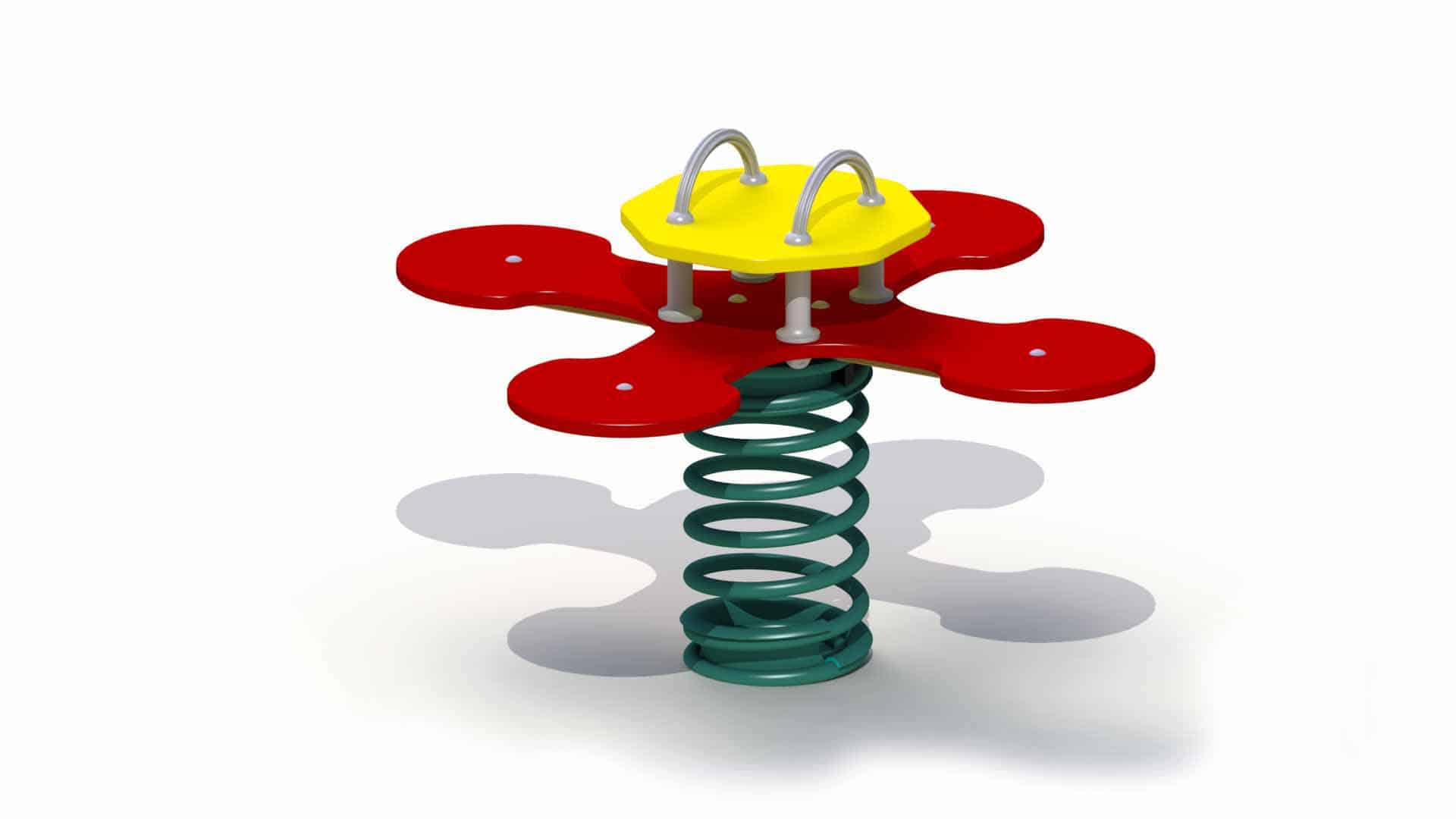 Veertoestel voor kinderen van 2 tot 6 jaar. Het veertoestel is opgebouwd uit een polyestergecoate veer die verankerd is op een gegalvaniseerde grondbevestiging. Bovenop staat een figuratief zitelement gemonteerd in de vorm van een bloem. De figuren en zitvlakken zijn opgebouwd uit vandalismebestendig en kleurvast 19mm HDPE polyethyleen. Op dit veertoestel kunnen tot 4 kinderen tegelijk spelen. De veer is vervaardigd uit 20 mm dik veerstaal. Alle metaalonderdelen zijn roestvrij voorbehandeld en alle moeren en bouten zijn volledig afgeschermd met bloemvormige afdekdoppen. De veer is zodanig ontworpen dat men nooit geklemd kan raken, ook niet bij de zwaarste belasting. De elasticiteit van de veer is zo berekend dat de beweging ook voor de kleintjes volledig tot zijn recht komt.