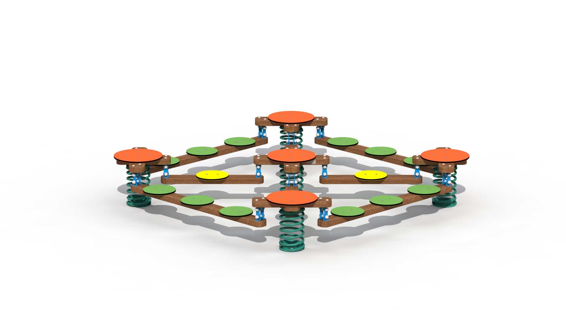 Veertoestel voor kinderen van 4 tot 15 jaar. Dit speeltoestel wordt in een vierkant geplaatst. De vier hoeken bestaan uit veren waarop ronde zittingen uit HDPE polyethyleen geplaatst worden. Ze worden met elkaar verbonden door middel van balken in padouk waarop telkens 3 ronde zittingen uit HDPE polyethyleen gemonteerd zijn. De balken worden zo gemonteerd dat ze lichtjes schommelen wanneer de kinderen erover lopen. Alle metalen onderdelen zijn roestvrij voorbehandeld en alle moeren en bouten zijn volledig afgeschermd met kunststof bloemvormige afdekdoppen. De veren worden met een gegalvaniseerd grondanker in de grond bevestigd.
