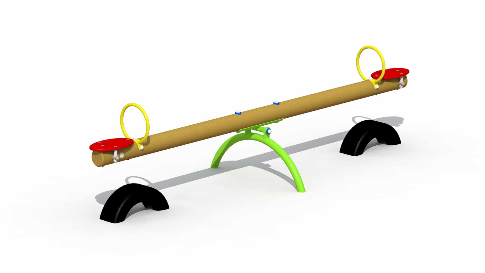 Wip voor kinderen van 4 tot 12 jaar. De wip is opgebouwd uit een groene polyestergecoate metalen grondverankering met daarop een rondhouten lariks paal buiten het hart gezaagd met een diameter van 14cm. De gebogen metalen buizen hebben een diameter van 63 mm. De zitvlakken zijn vervaardigd uit vandalismebestendig en kleurvast HDPE polyethyleen. De ronde metalen handvatten bestaan uit polyestergecoate metalen buizen. Het scharniermechanisme bestaat uit een onderhoudsvrije as met nylon hulzen. Alle moeren en bouten zijn volledig afgeschermd met kunststof bloemvormige afdekdoppen. Bij de wip worden eveneens twee afstootbanden voorzien.