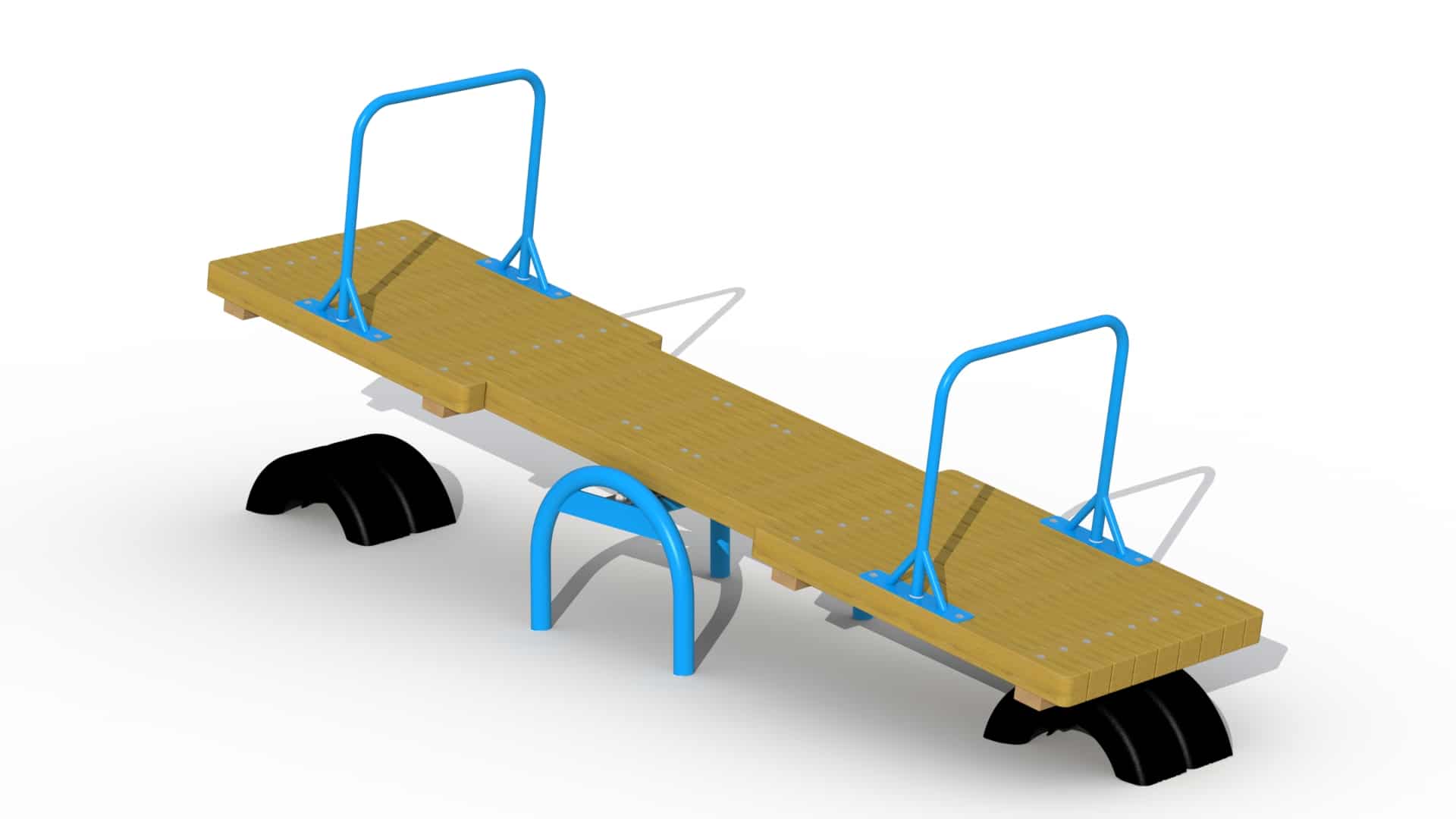 Brede staande wip voor kinderen van 4 tot 12 jaar. De wip bestaat uit een breed draagvlak in lariks hout. Bovenop dit draagvlak staan 2 metalen steunen waaraan kinderen zich kunnen vasthouden. Alle moeren en bouten zijn volledig afgeschermd met kunststof bloemvormige afdekdoppen. Bij de wip worden eveneens vier afstootbanden voorzien.