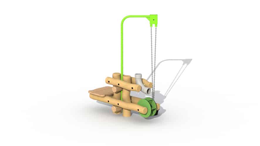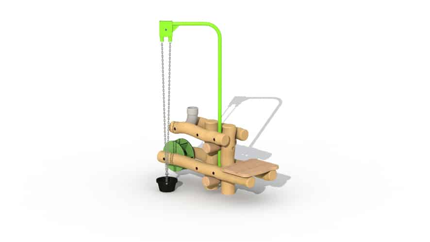 Zandspeeltoestel voor kinderen van 2 tot 6 jaar. Aan dit toestel is er een zandkraan met zandemmer voorzien alsook een groen rad. De horizontale rondhouten lariks palen hebben een diameter van 10 en zijn buiten het hart gezaagd. De verticale palen zijn vervaardigd uit robinia met diameter 12/14 cm (omwille van het rechtstreekse grondcontact). De zandemmer en het rad zijn vervaardigd uit kunststof, de zandkraan is polyester gecoat. Alle metaalonderdelen zijn roestvrij voorbehandeld en alle moeren en bouten zijn volledig afgeschermd met kunststof afdekdoppen.